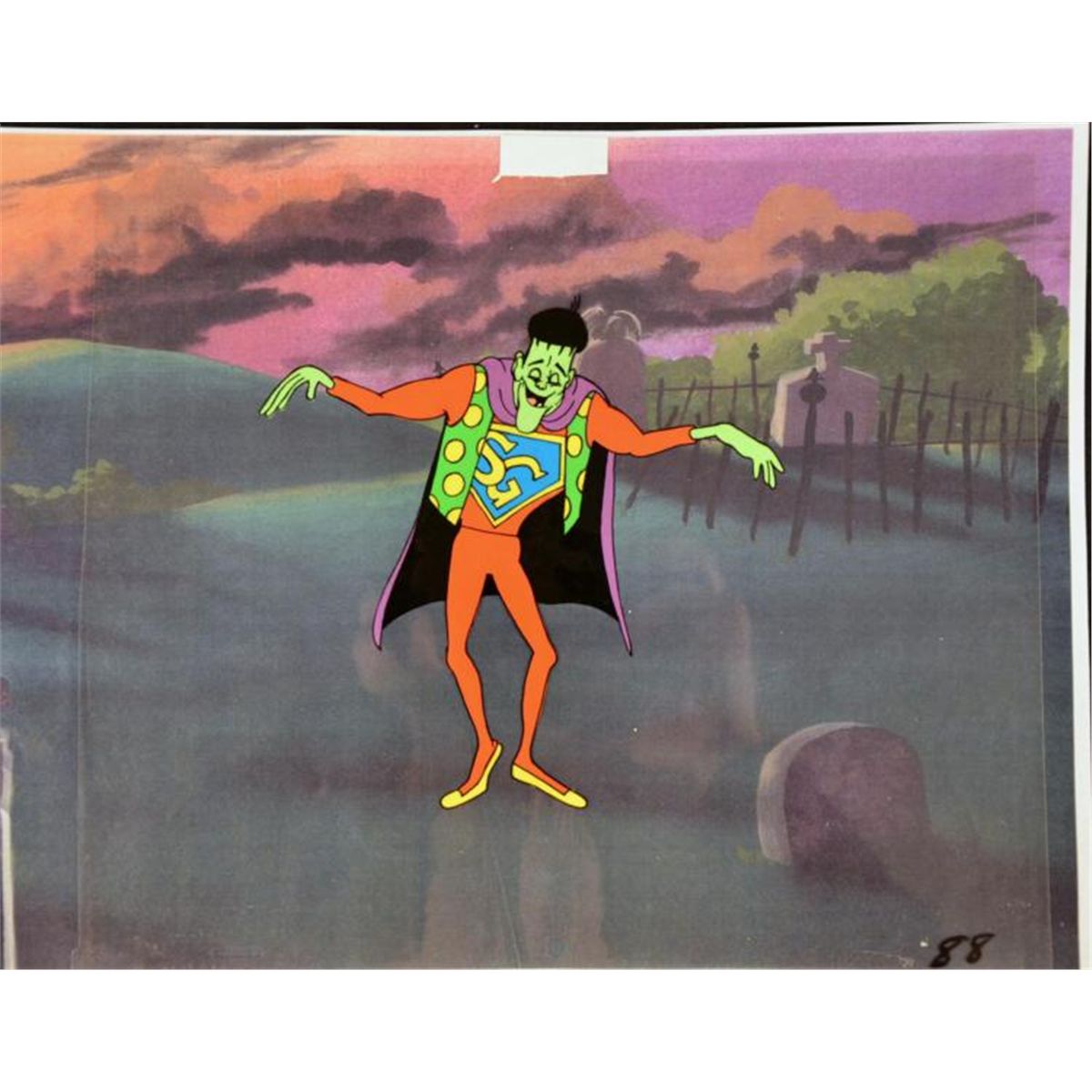 This fine original production cel features Frankie, a Frankenstein Monster, from the television animated series Groovie Goolies. * Medium: Hand painted cel acetate on two sheets (head and body are done separately), with printed background Sheet size: 11 x 14 inches Condition: Excellent