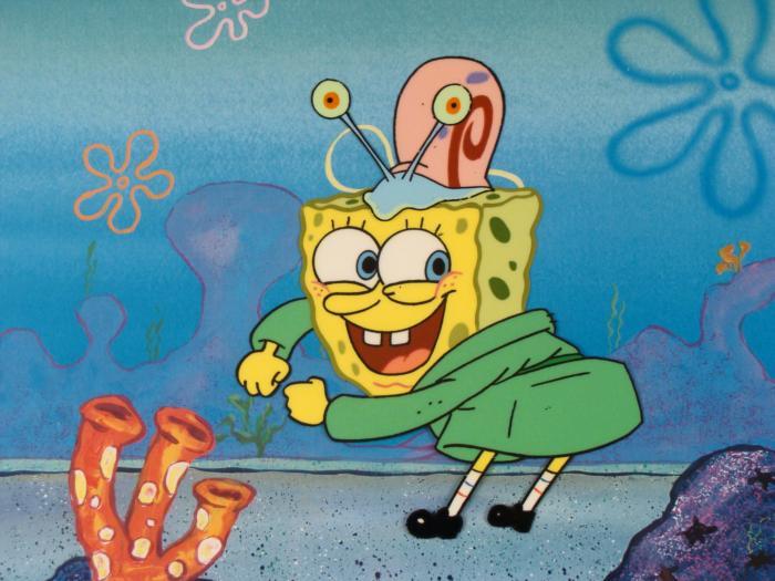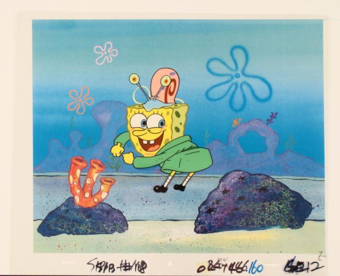 This original animation cel and reproduction background is from the Nickelodeon TV show SpongeBob Squarepants. The story takes place under the deep blue sea in Bikini Bottom, where SpongeBob resides. SpongeBob, who is a yellow, porous sponge, is your typical happy-go-lucky character, as he is always cheerful and enjoys making people laugh. Patrick Star, SpongeBob's neighbor who is a starfish, is your average children's show idiot, as he boasts knowing nothing and is often getting himself into ridiculous situations. Between the homes of these two lies the home of the miserable Squidward, a squid, who is known for being grouchy and playing tricks on SpongeBob and Patrick. Both SpongeBob and Squidward work at the Krusty Krab, a fast food business run by the greedy money-loving Mr. Krabs, a crab, the arch rival of the evil, possibly misunderstood, Plankton. Another neighbor, Sandy Cheeks, an athletic squirrel who normally wears an astronaut's space suit, was introduced in "Tea at the Treedome." She spends most of her time inventing and experimenting. Spongebob is moving and grooving his way to Funky Town.Original Production Animated Cel Reproduction BackgroundOverall Size of Background: 11" x 17" Overall Size of the Cels: 10 1/2" x 12 1/2" Excellent ConditionThis is an original hand-painted cel set-up used in the production of an episode of "SpongeBob SquarePants." Each one-of-a-kind set-up represents a slight change in position of the characters. When individually photographed and projected in rapid succession, the images appear to move.