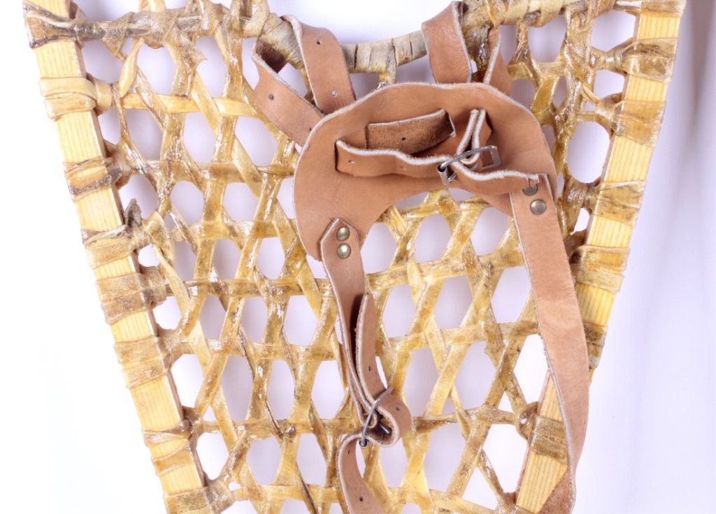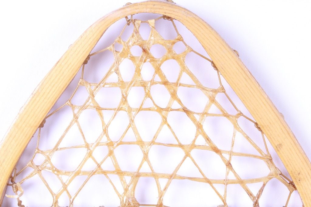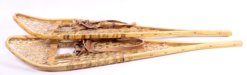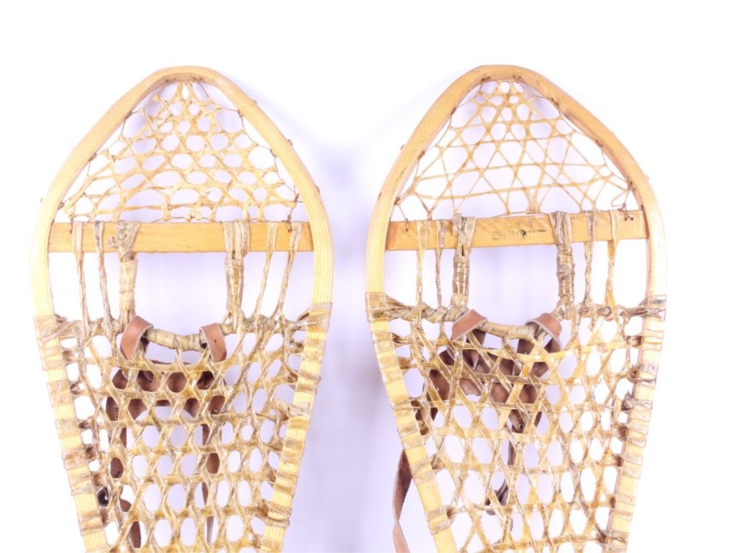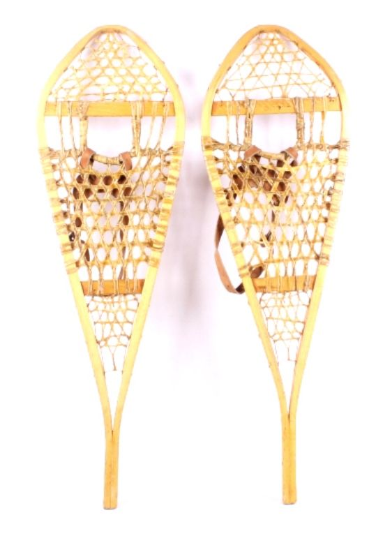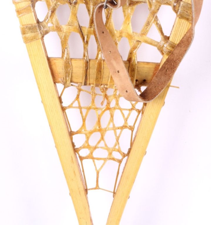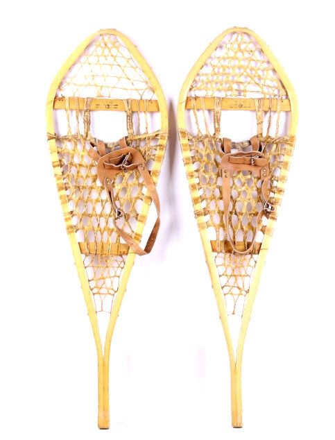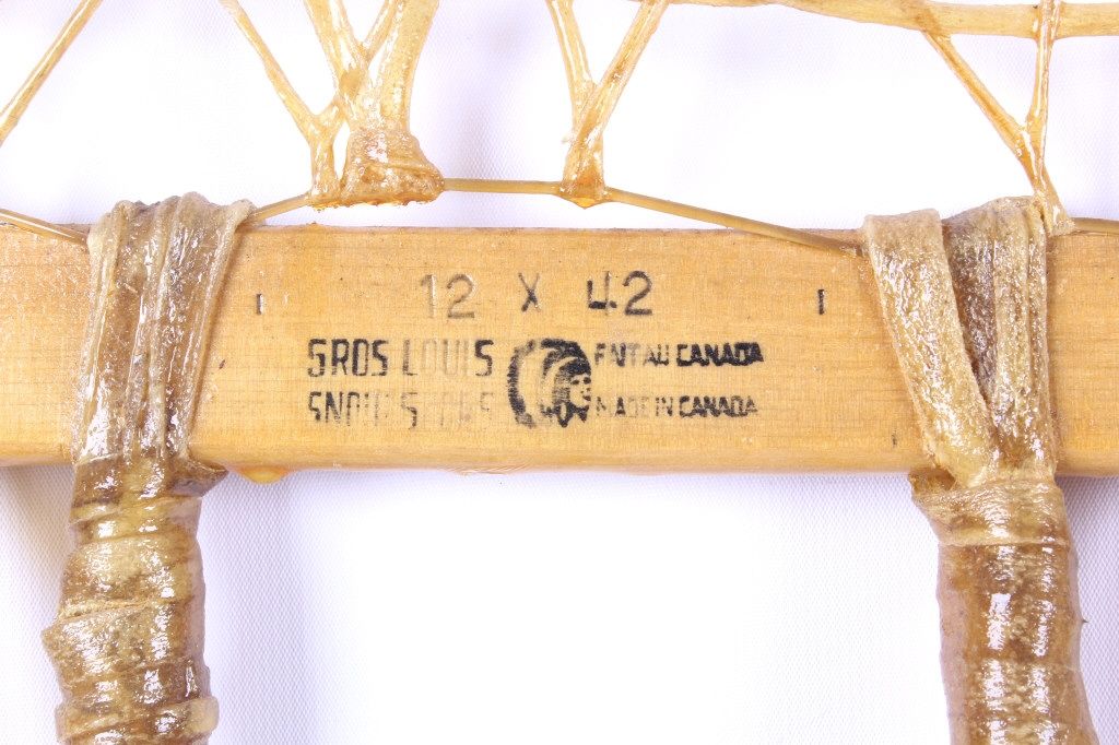 This lot features a pair of Gros Louis snowshoes. They were made in Canada. The snowshoes have rawhide webbing and leather bindings, which are in very good condition. They are size 12.5" x 42".