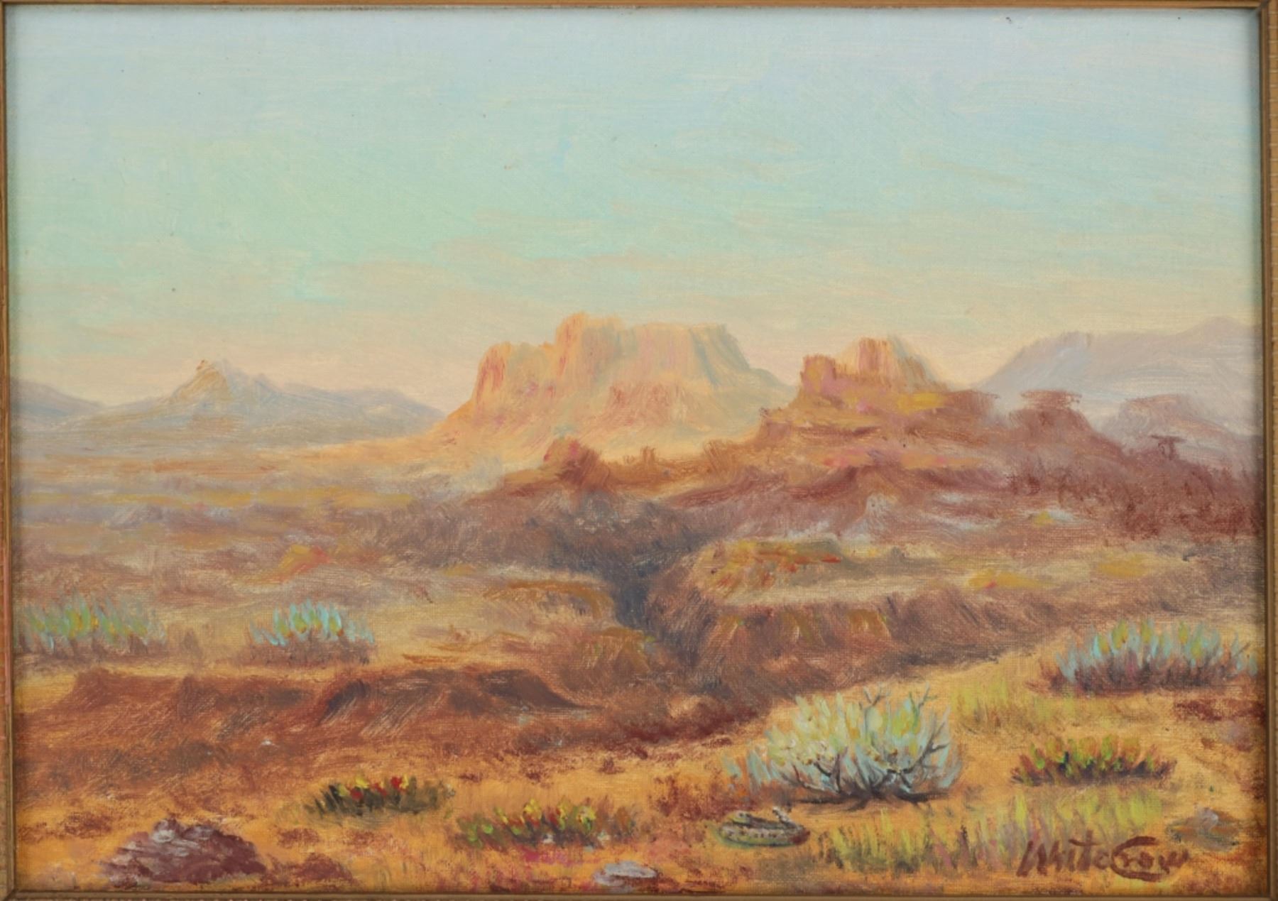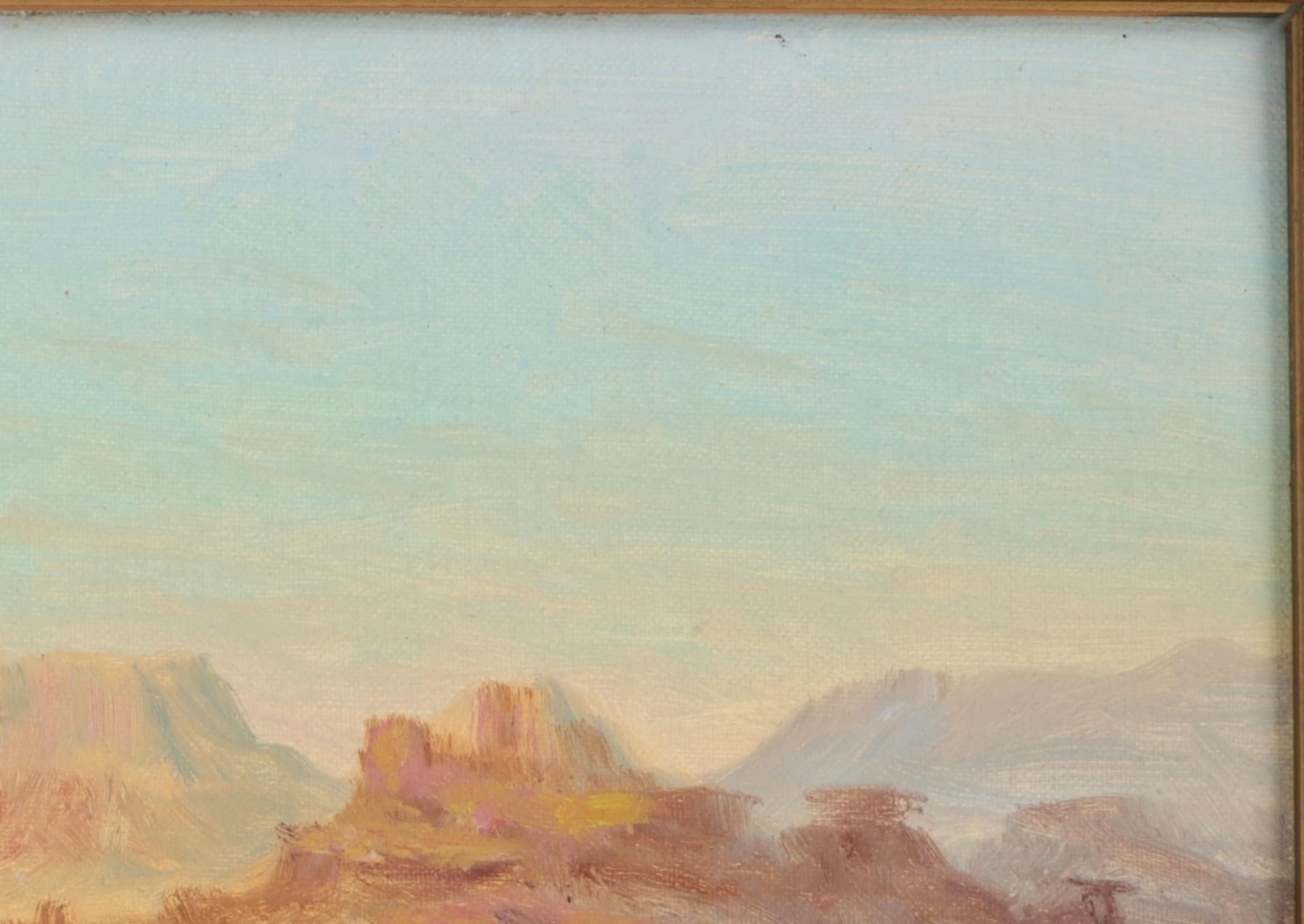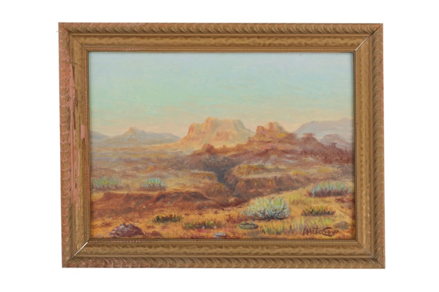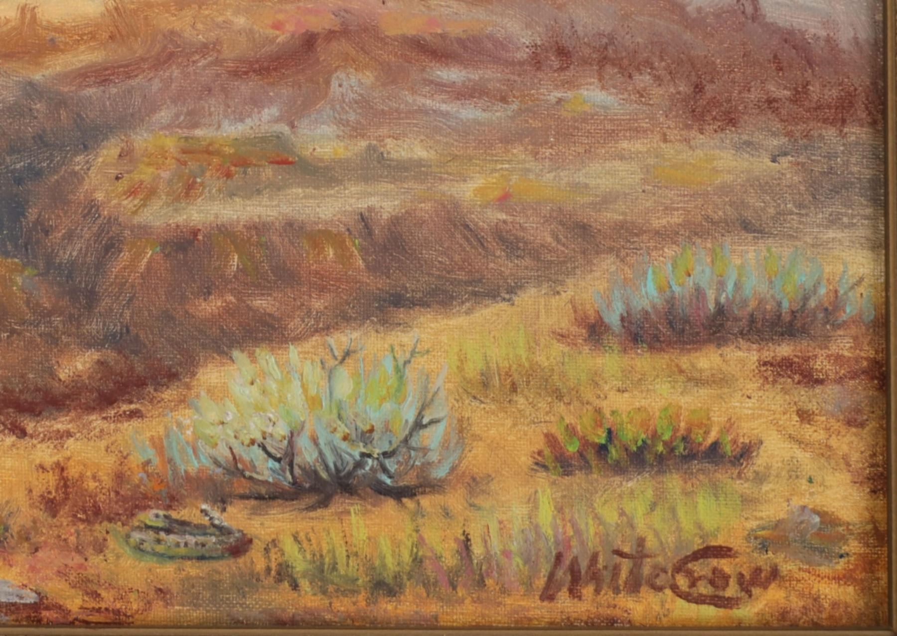 Featured in this lot is this original desert landscape oil on canvas stretched on board painting by Gros Ventre artist White Crow circa 1951. The painting features a wonderfully and professionally crafted oil on canvas stretched on board construction that shows a desert landscape with butte's in the distance and a canyon leading up to them with sagebrush in the fore front of the painting. The artist signature is in the bottom right hand corner. The painting comes complete with a typed correspondence between a Mr. Kleinschmidt and a E.A. Brininstool that talks about research and book material surrounding Custer's Last Stand; they briefly mention White Crow and his occupation as a painter and his involvement with the US Military. The back of the painting is marked as follows: White Crow Gros Ventres Indian Artist - (Little Crow and his wife tell me he is a Gros Ventres) Aka Miles S Horn - 8/1/51. The condition of this Painting from Gros Ventres artist is good with no obvious signs of damage to the artwork and the frame shows some fading and chipping to the paint but otherwise is in good overall condition. The measurements of this framed painting is 12 1/2" x 16 1/2" and the visible artwork measures 9 1/2" x 13 1/2". The collective weight of this 1lb 4oz. The painting comes with a museum tag that reads as follows: 1396-87 - O'dell. Provenance: From the John Kleinschmidt collection which was on loan to the C.M. Russell Museum from 1987 to 1993 and included in the "The Cowboy West: 100 Years of Photography 1992-1993 exhibit.