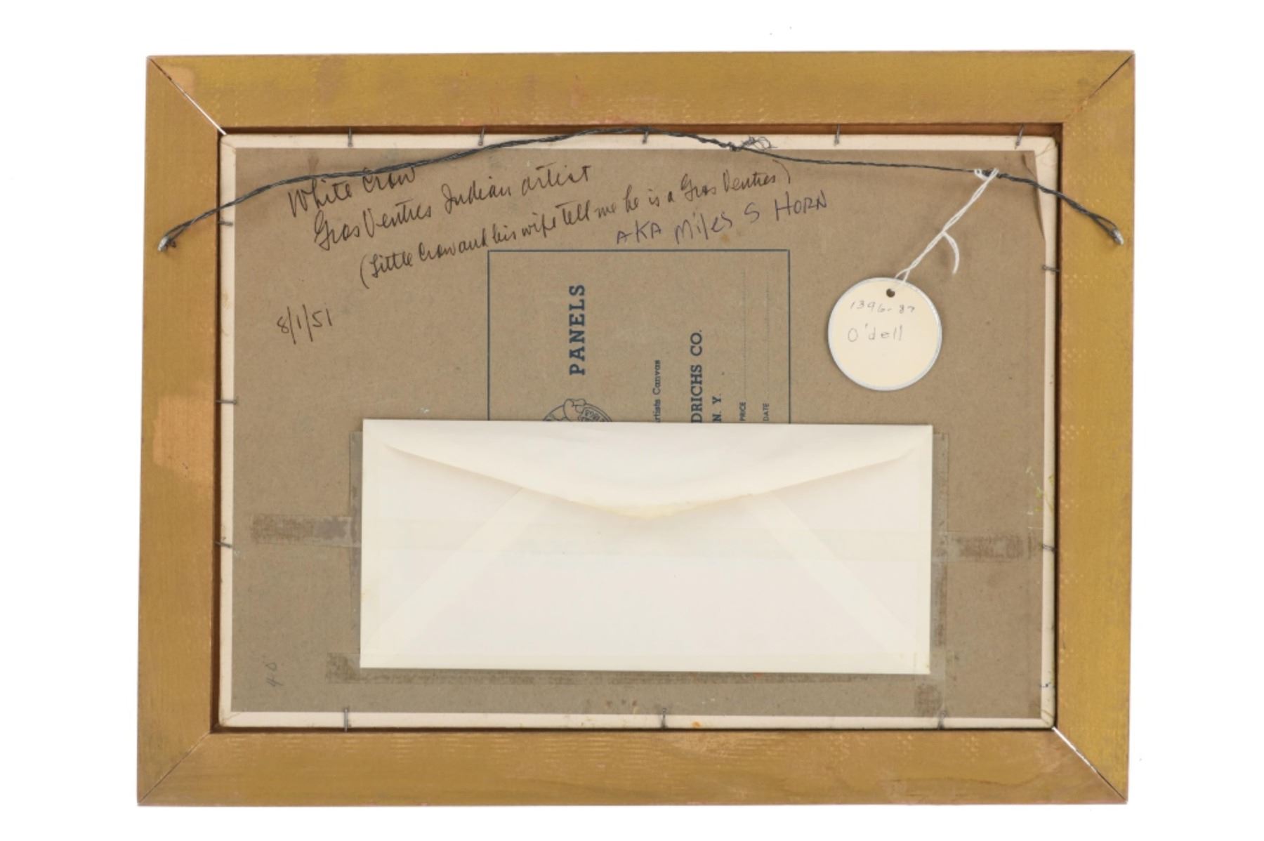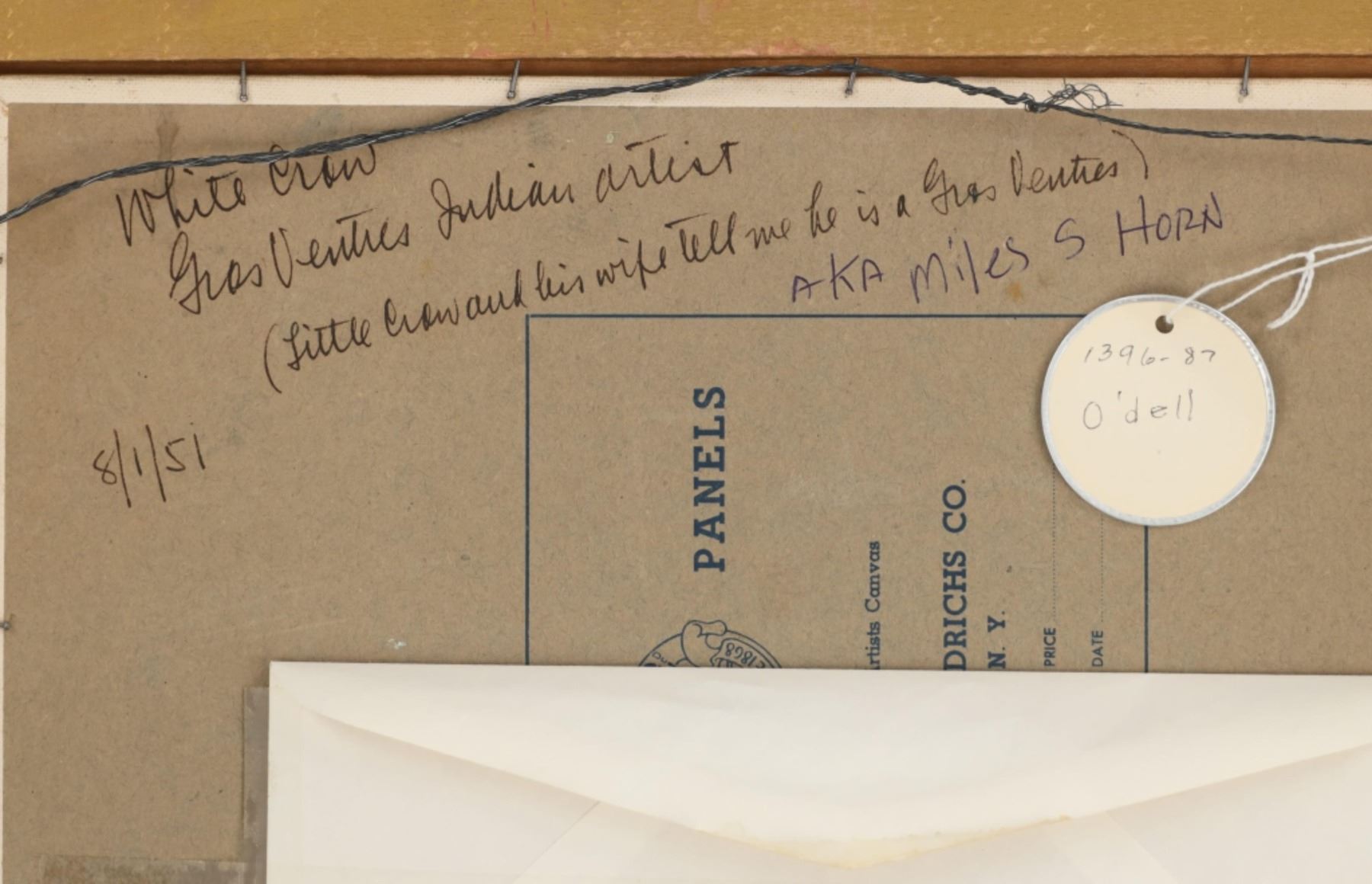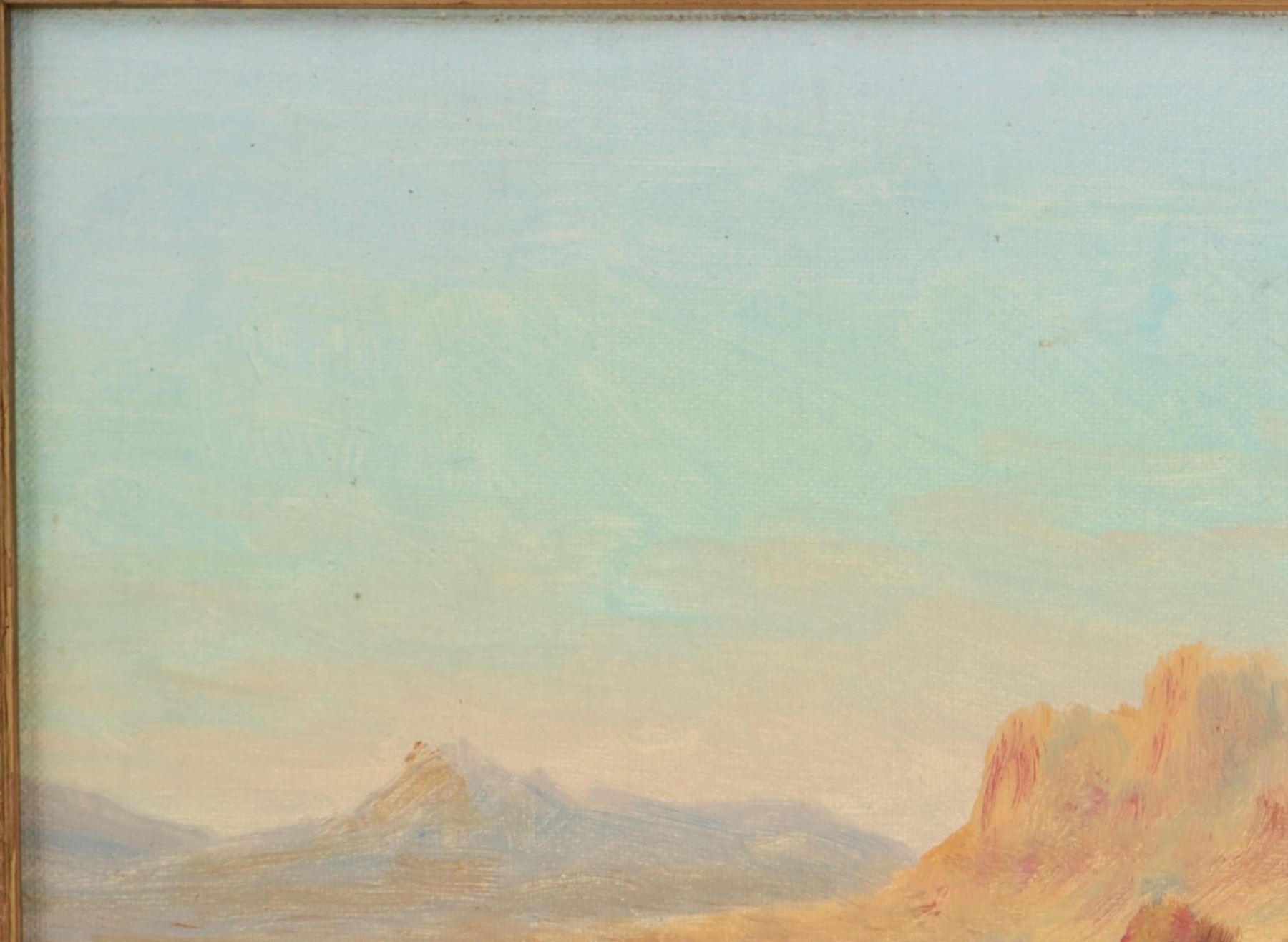 Featured in this lot is this original desert landscape oil on canvas stretched on board painting by Gros Ventre artist White Crow circa 1951. The painting features a wonderfully and professionally crafted oil on canvas stretched on board construction that shows a desert landscape with butte's in the distance and a canyon leading up to them with sagebrush in the fore front of the painting. The artist signature is in the bottom right hand corner. The painting comes complete with a typed correspondence between a Mr. Kleinschmidt and a E.A. Brininstool that talks about research and book material surrounding Custer's Last Stand; they briefly mention White Crow and his occupation as a painter and his involvement with the US Military. The back of the painting is marked as follows: White Crow Gros Ventres Indian Artist - (Little Crow and his wife tell me he is a Gros Ventres) Aka Miles S Horn - 8/1/51. The condition of this Painting from Gros Ventres artist is good with no obvious signs of damage to the artwork and the frame shows some fading and chipping to the paint but otherwise is in good overall condition. The measurements of this framed painting is 12 1/2" x 16 1/2" and the visible artwork measures 9 1/2" x 13 1/2". The collective weight of this 1lb 4oz. The painting comes with a museum tag that reads as follows: 1396-87 - O'dell. Provenance: From the John Kleinschmidt collection which was on loan to the C.M. Russell Museum from 1987 to 1993 and included in the "The Cowboy West: 100 Years of Photography 1992-1993 exhibit.