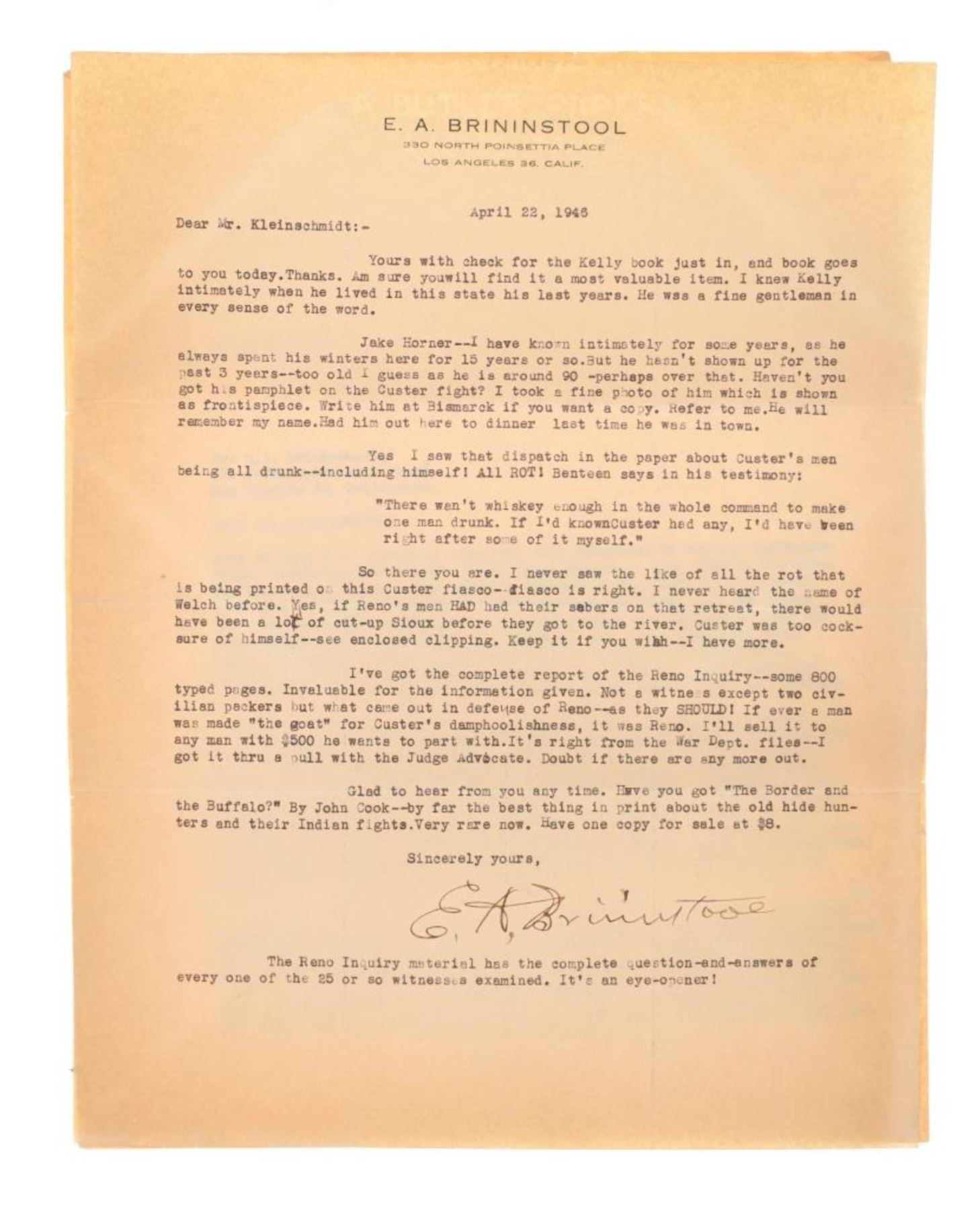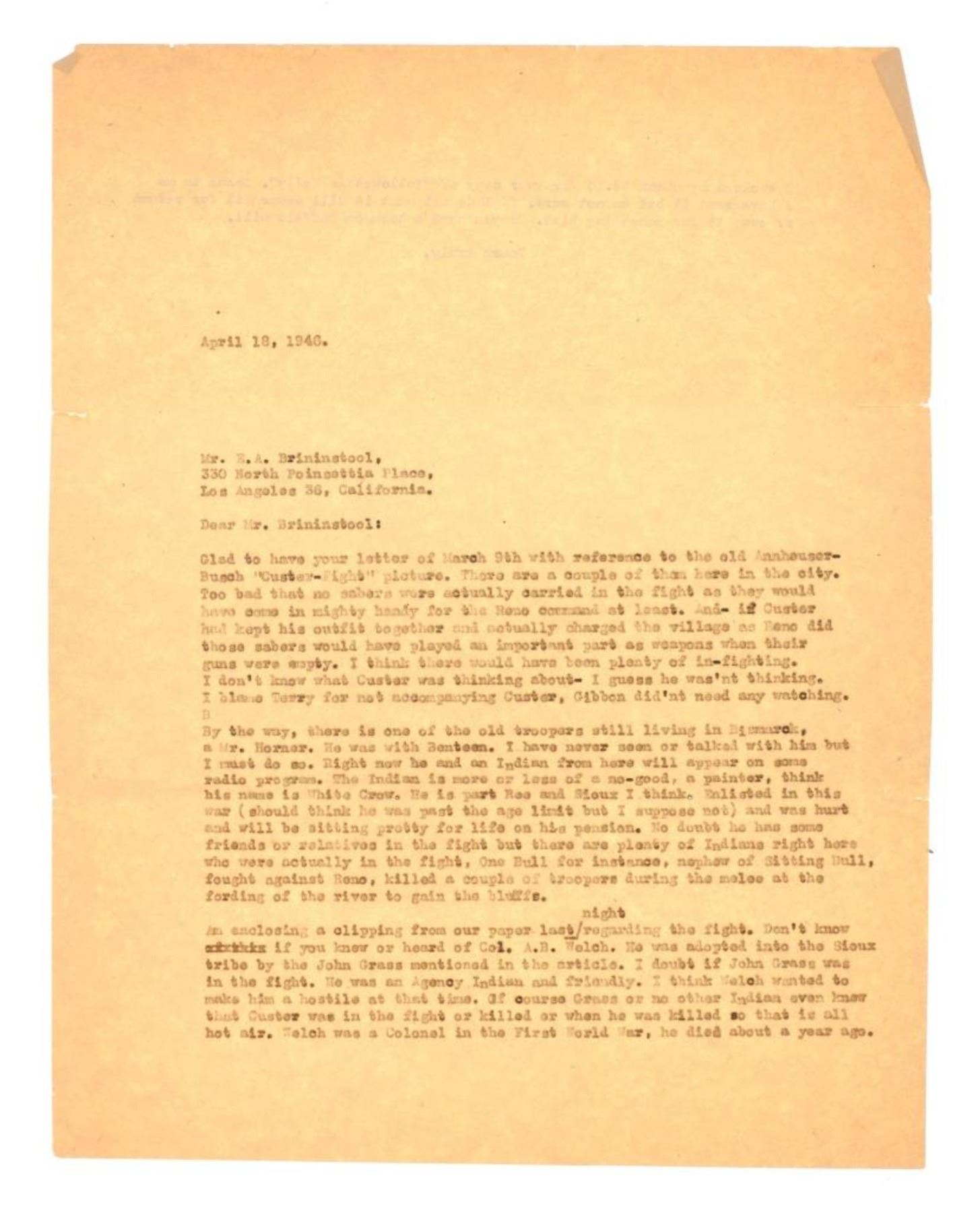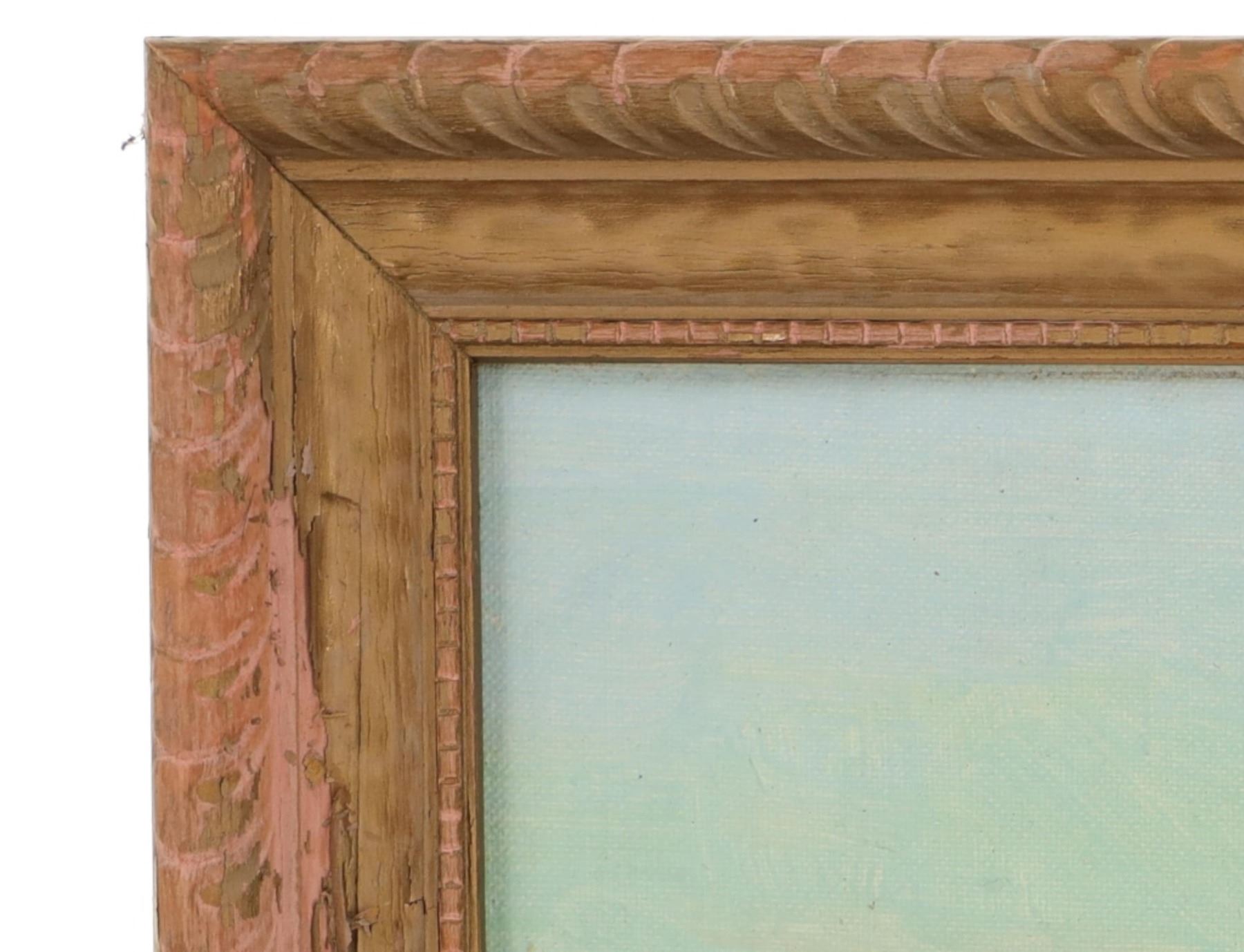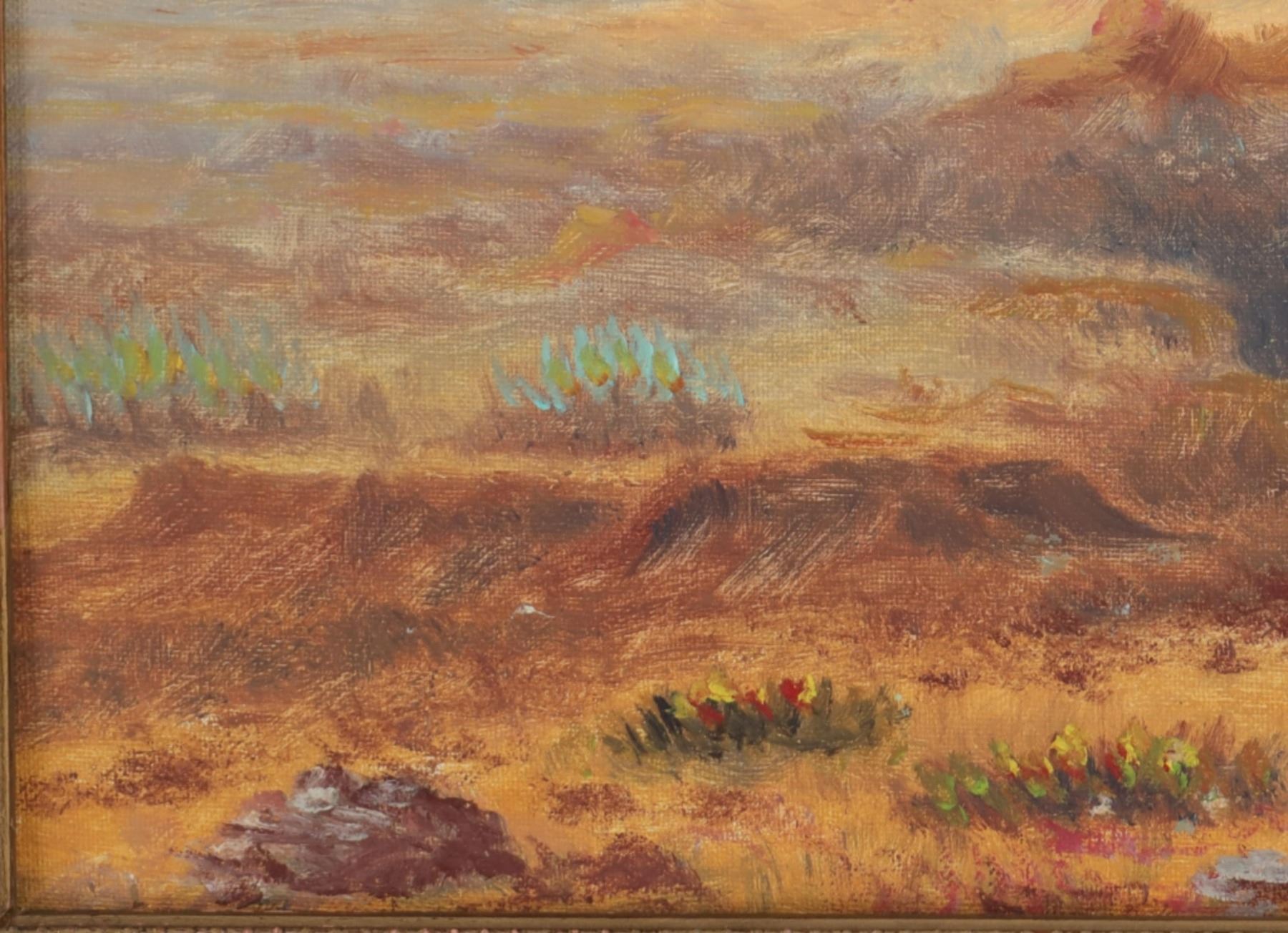 Featured in this lot is this original desert landscape oil on canvas stretched on board painting by Gros Ventre artist White Crow circa 1951. The painting features a wonderfully and professionally crafted oil on canvas stretched on board construction that shows a desert landscape with butte's in the distance and a canyon leading up to them with sagebrush in the fore front of the painting. The artist signature is in the bottom right hand corner. The painting comes complete with a typed correspondence between a Mr. Kleinschmidt and a E.A. Brininstool that talks about research and book material surrounding Custer's Last Stand; they briefly mention White Crow and his occupation as a painter and his involvement with the US Military. The back of the painting is marked as follows: White Crow Gros Ventres Indian Artist - (Little Crow and his wife tell me he is a Gros Ventres) Aka Miles S Horn - 8/1/51. The condition of this Painting from Gros Ventres artist is good with no obvious signs of damage to the artwork and the frame shows some fading and chipping to the paint but otherwise is in good overall condition. The measurements of this framed painting is 12 1/2" x 16 1/2" and the visible artwork measures 9 1/2" x 13 1/2". The collective weight of this 1lb 4oz. The painting comes with a museum tag that reads as follows: 1396-87 - O'dell. Provenance: From the John Kleinschmidt collection which was on loan to the C.M. Russell Museum from 1987 to 1993 and included in the "The Cowboy West: 100 Years of Photography 1992-1993 exhibit.