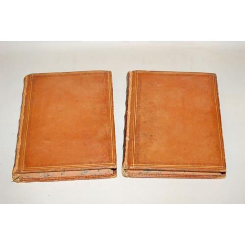 Grose, Francis. The Antiquities of Scotland - 2 Volumes. London: Printed for Hooper & Wigstead, 1797. First Edition. 4to - over 9¾" - 12" tall. Hard Cover. Ex-Library. Good Condition. Title vignettes, large hand colored folding map and 190 engraved plates, with descriptive text. Bound in leather with raised bands on spines, gilt borders & blind stamped designs on covers, inner dentelles, marbled endpapers, marbled page edges all around, with ribbon page markers. Front cover detached on vol. II, chips to top/heel of backstrips, moderate foxing.
