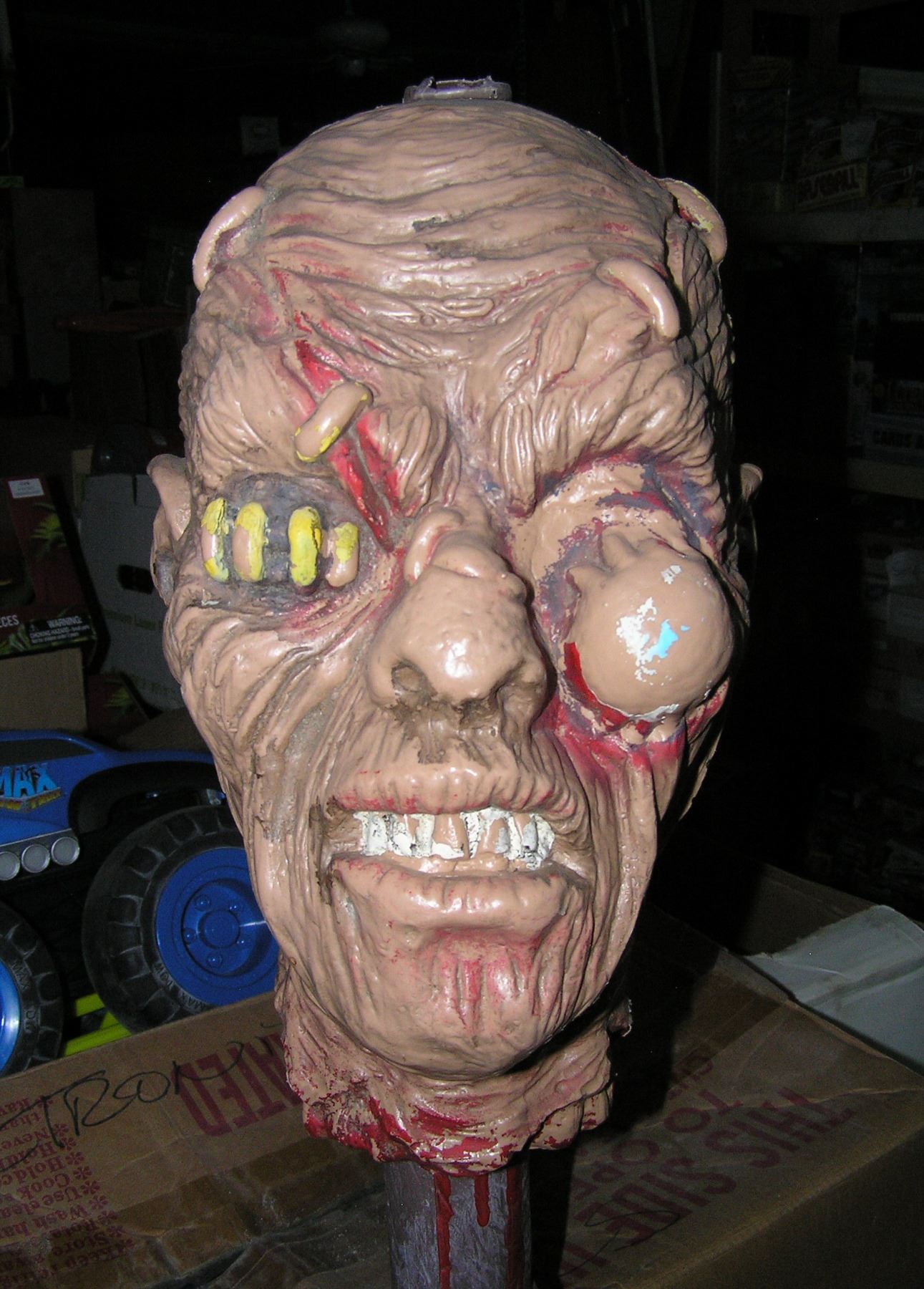 Grotesque Halloween monster head made of hard plastic on a rope decorated plastic pole est. value $65.00-$100.00