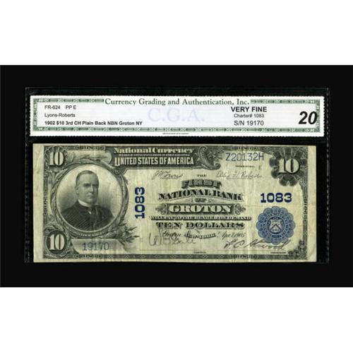 <B>Groton, NY</B></I> - $10 1902 Plain Back Fr. 624 <B>The First NB</B></I> Ch. # 1083<BR> An evenly circulated large example from the sole bank to issue in this Tompkins County hamlet. <B>CGA Very Fine 20</B></I>.<BR><BR><b>Shipping:</b> Coins & Currency (<a target="_blank" href="http://www.heritageauctions.com/common/shipping.php">view shipping information</a>)