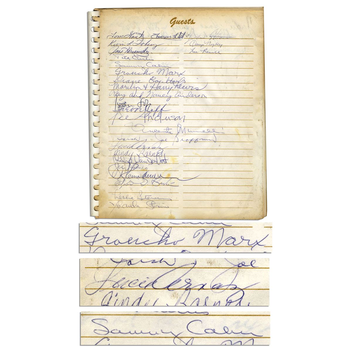 Groucho Marx signs a guest register for an event in Beverly Hills, along with Vincente Minelli, Academy Award winning songwriter Sammy Cahn and Lucie Arnaz, daughter of Lucy and Desi Arnaz. Total number of signatures is more than 135. Minor soiling to six pages of signatures in 8.5'' x 10.5'' spiral bound book, and separation to front cover at binding. No back cover. Overall very good condition.