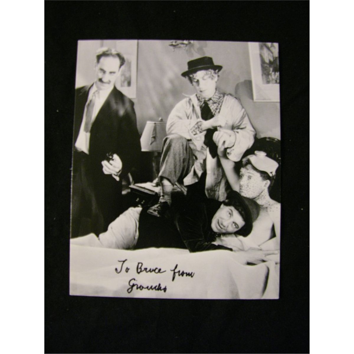 Signed greeting card depicting a scene from Room Service (1938) signed in black felt pen by Groucho Marx. Groucho has written, "To Bruce from Groucho". (approx. 7 1/2" x 6 ")
