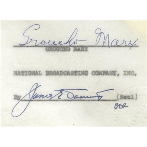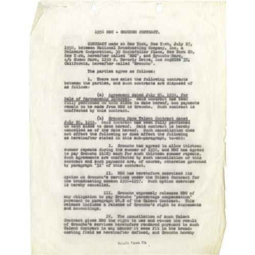 <B>Groucho Marx Signed Contract.</B></I> A 50-page agreement between Marx and NBC, dated July 27, 1956, and signed by Marx on the last page in black ink. In Fine to Very Fine condition with mild overall tanning and wear around the edges, as well as staple and binder holes to the top edge.<I>Accompanied by LOA from PSA/DNA.</B></I><BR><BR><b>Shipping:</b> Flat Material, Small (<a target="_blank" href="http://www.heritageauctions.com/common/shipping.php">view shipping information</a>) <BR><BR><B>Important notice: