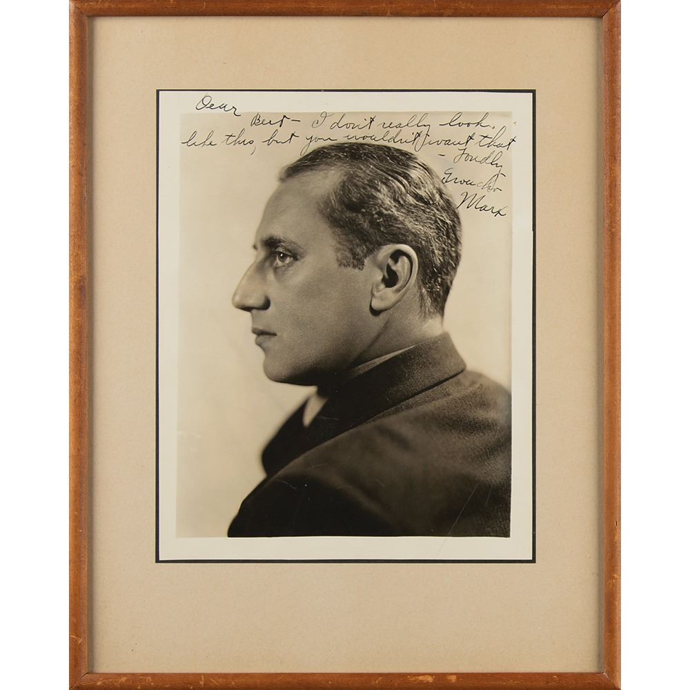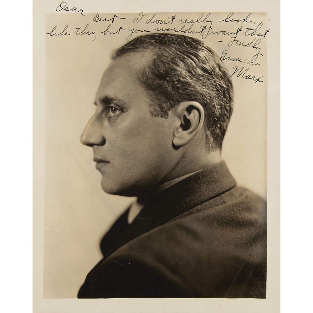 Vintage circa 1933 matte-finish 7.75 x 9.75 profile photo of Groucho without his mustache, signed and inscribed in fountain pen, "Dear Bert—I don't really look like this, but you wouldn't want that—Fondly, Groucho Marx.” Mounted and framed to an overall size of 11.75 x 14.5. In fine condition, with a few light creases and neatly trimmed edges.