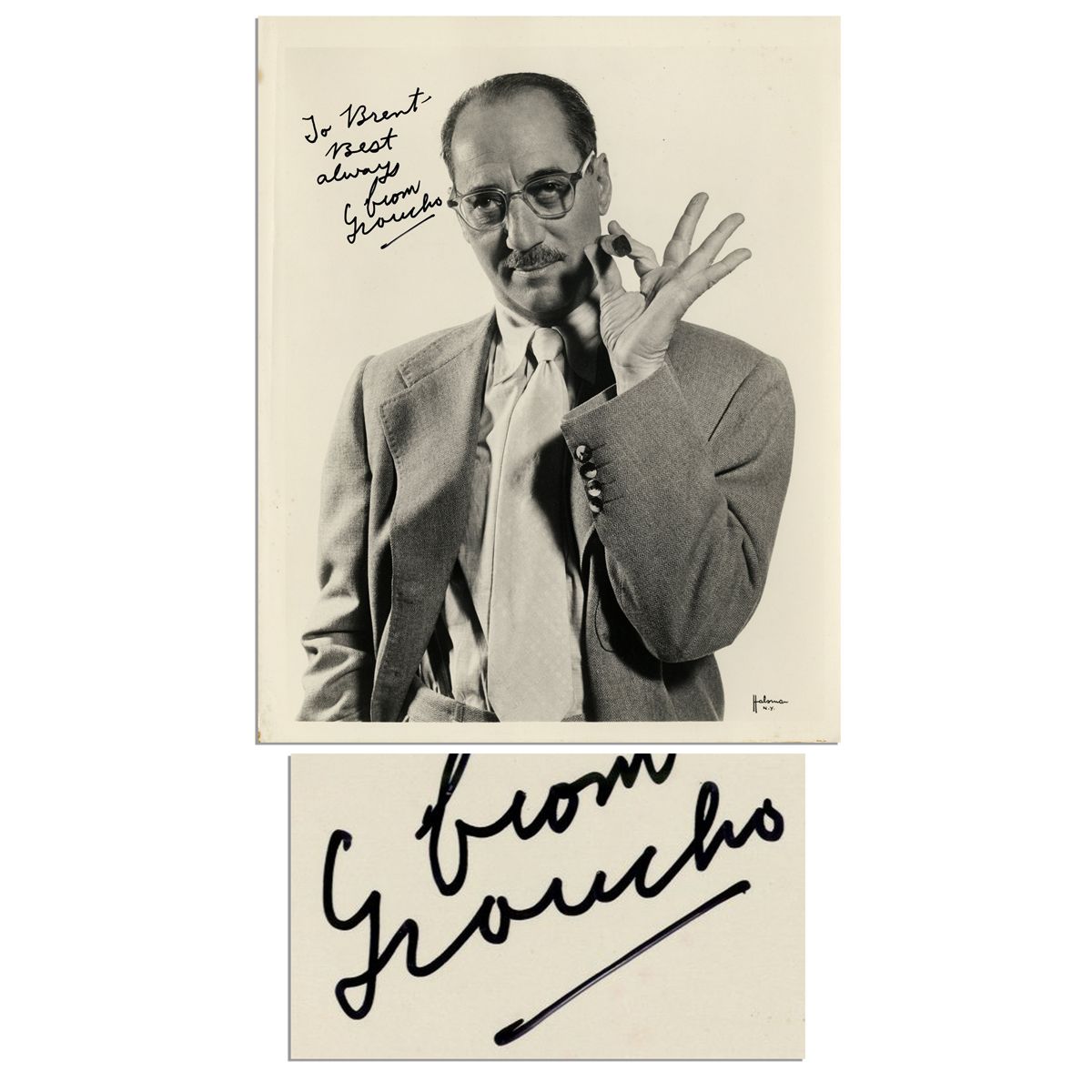 Groucho Marx signed and inscribed 8'' x 10'' glossy photo. Inscribed in black marker: ''To Brent - Best always from / Groucho''. Some wrinkling and toning, else very good.