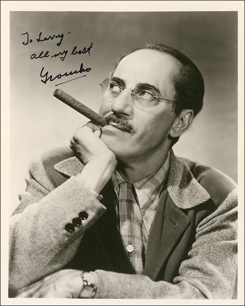 Glossy 8 x 10 photo of Groucho with a cigar clenched in his teeth, signed and inscribed in black felt tip “To Larry–all my best, Groucho.” In fine condition, with a few edge dings and corner tip creases, and some mild vertical streaking to emulsion.