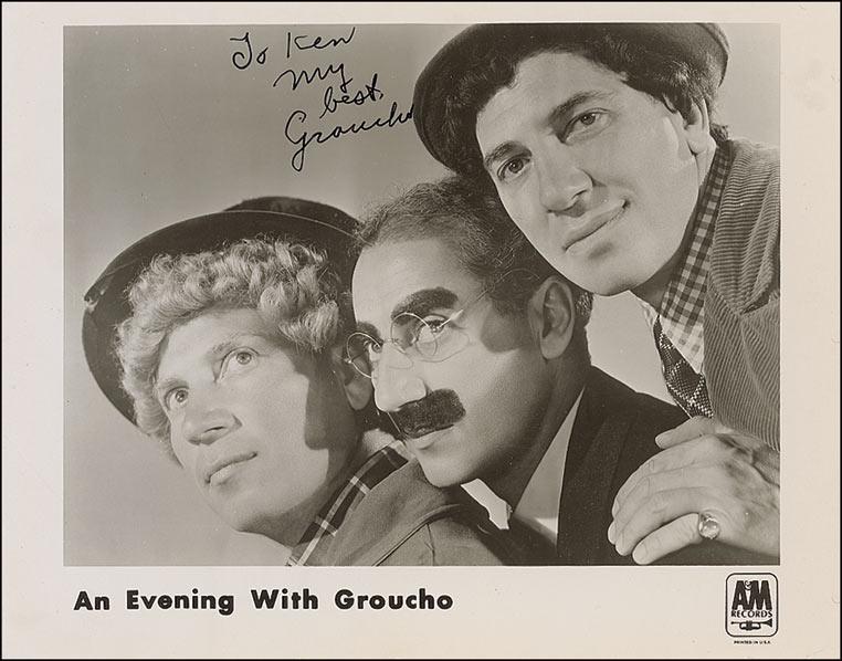 Glossy 10 x 8 A&M Records publicity photo of Groucho, Harpo, and Chico for An Evening with Groucho, signed and inscribed in black felt tip “To Ken, my best, Groucho.” In fine condition, with some scattered light surface marks and dings.