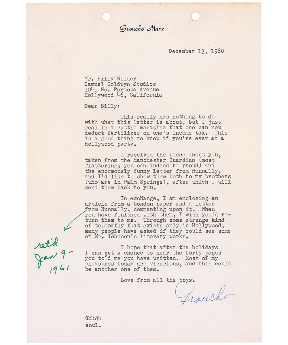 TLS signed “Groucho,” one page, 7.25 x 10.5, personal letterhead, December 13, 1960. Letter to director Billy Wilder at Samuel Goldwyn Studios. In part: “This really has nothing to do with what this letter is about, but I just read in a cattle magazine that one can now deduct fertilizer on one’s income tax. This is a good thing to know if you’re ever at a Hollywood party. I received the piece about you, taken from the Manchester Guardian…and the enormously funny letter from Nunnally, and I’d like to show them both to my brothers…I hope that after the holidays I can get a chance to hear the forty pages you told me you have written. Most of my pleasures today are vicarious, and this could be another one of them.” In fine condition, with two punch holes to top edge, an office notation to left side, and some light toning along top edge. Wilder was indeed in discussions over a new Marx Brothers comedy, with a proposed title of A Day At the U.N, but abandoned the project after the death of Chico Marx in 1961.