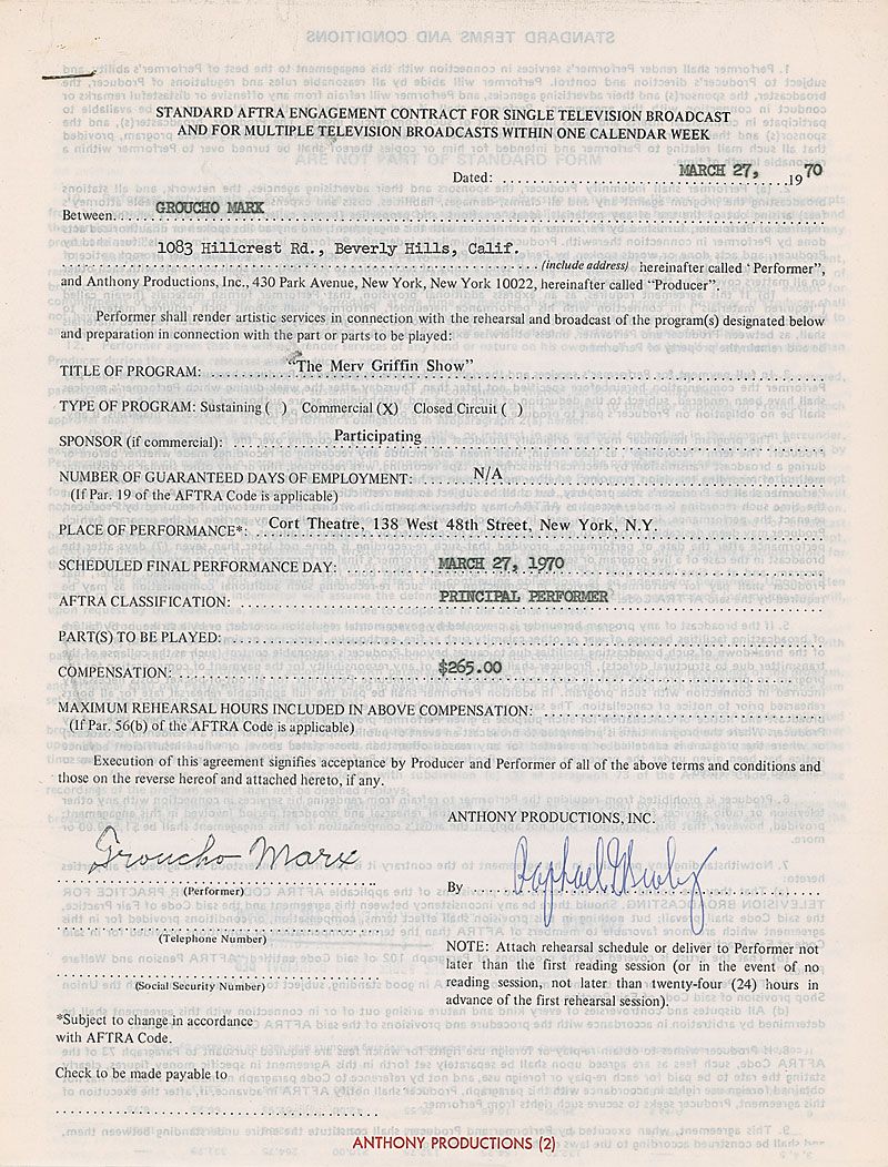 DS, one page, 8.5 x 11, March 27, 1970. Standard AFTRA contract in which Marx agrees to appear on The Merv Griffin Show on the same day in exchange for $265. Signed at the conclusion in ballpoint by Marx. A standard AFTRA rider is stapled to the main document in the upper left. In fine condition, with expected document wear.