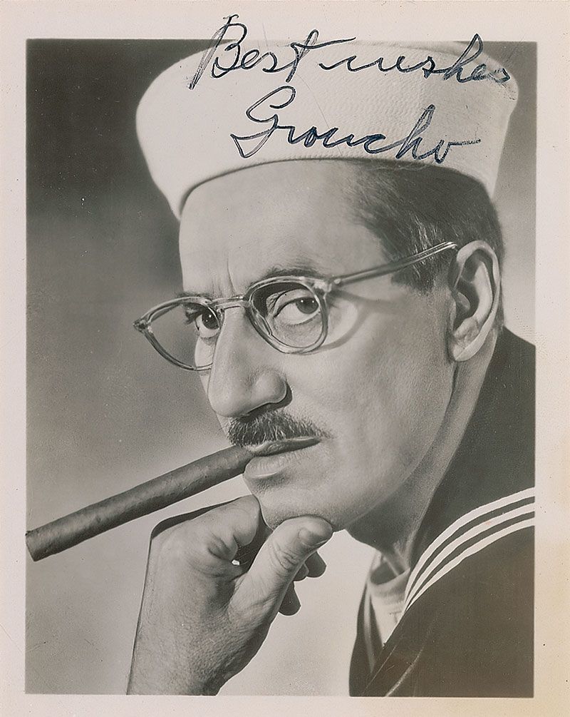 Glossy 4 x 5 photo of Groucho in a Navy uniform, signed in black felt tip, “Best wishes, Groucho.” In fine condition, with a slight brush to sentiment as well as a few light creases.