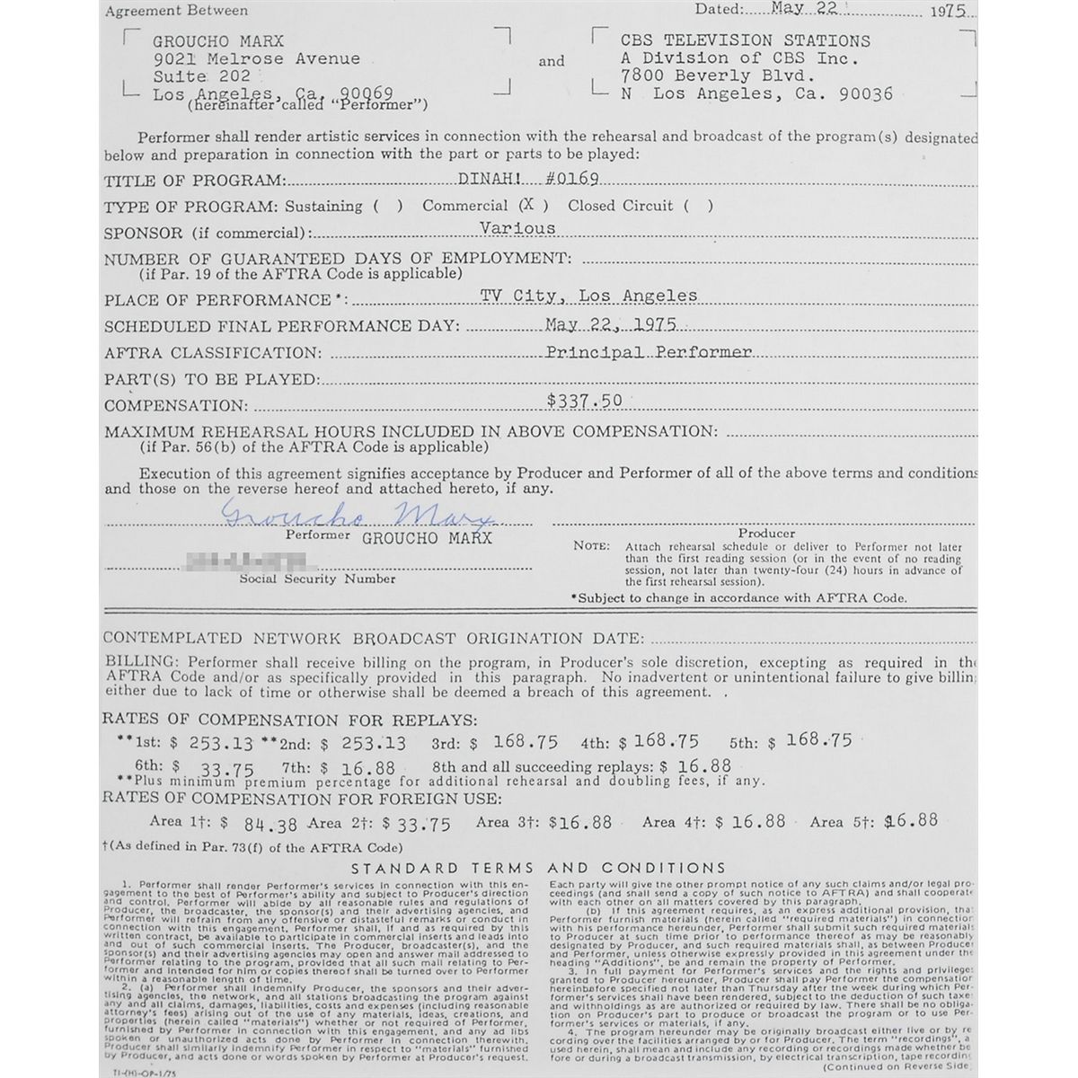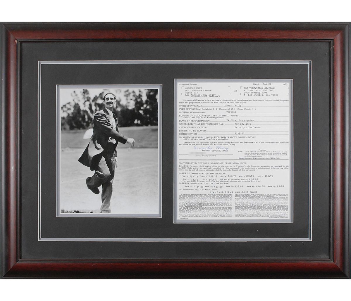 DS one page, 8.25 x 10.25, May 22, 1975. Groucho agrees to appear on the Dinah! Show on May 22, for a payment of $337.50. Signed in blue ballpoint by Groucho. Double-matted and framed with a photo of Groucho clowning around outdoors to an overall size of 26.5 x 19.75. In fine condition. Oversized.