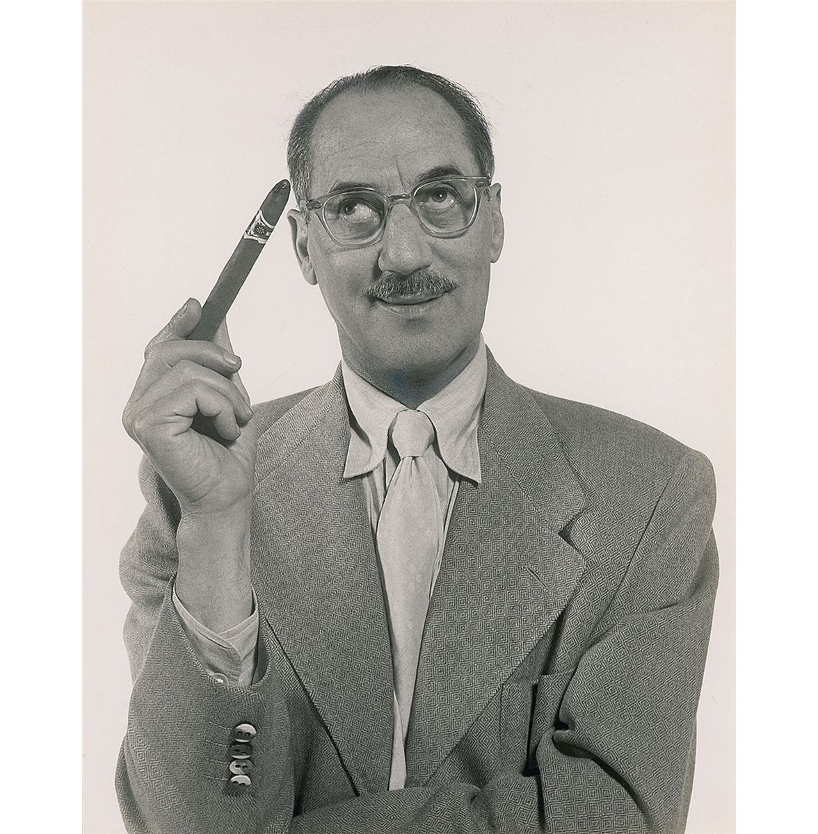 Iconic original matte-finish 10.75 x 13.75 half-length portrait of Marx holding his trademark cigar in a classic comedy pose, taken by world-renowned photographer Philippe Halsman and bearing his copyright stamp on the reverse. In fine condition.