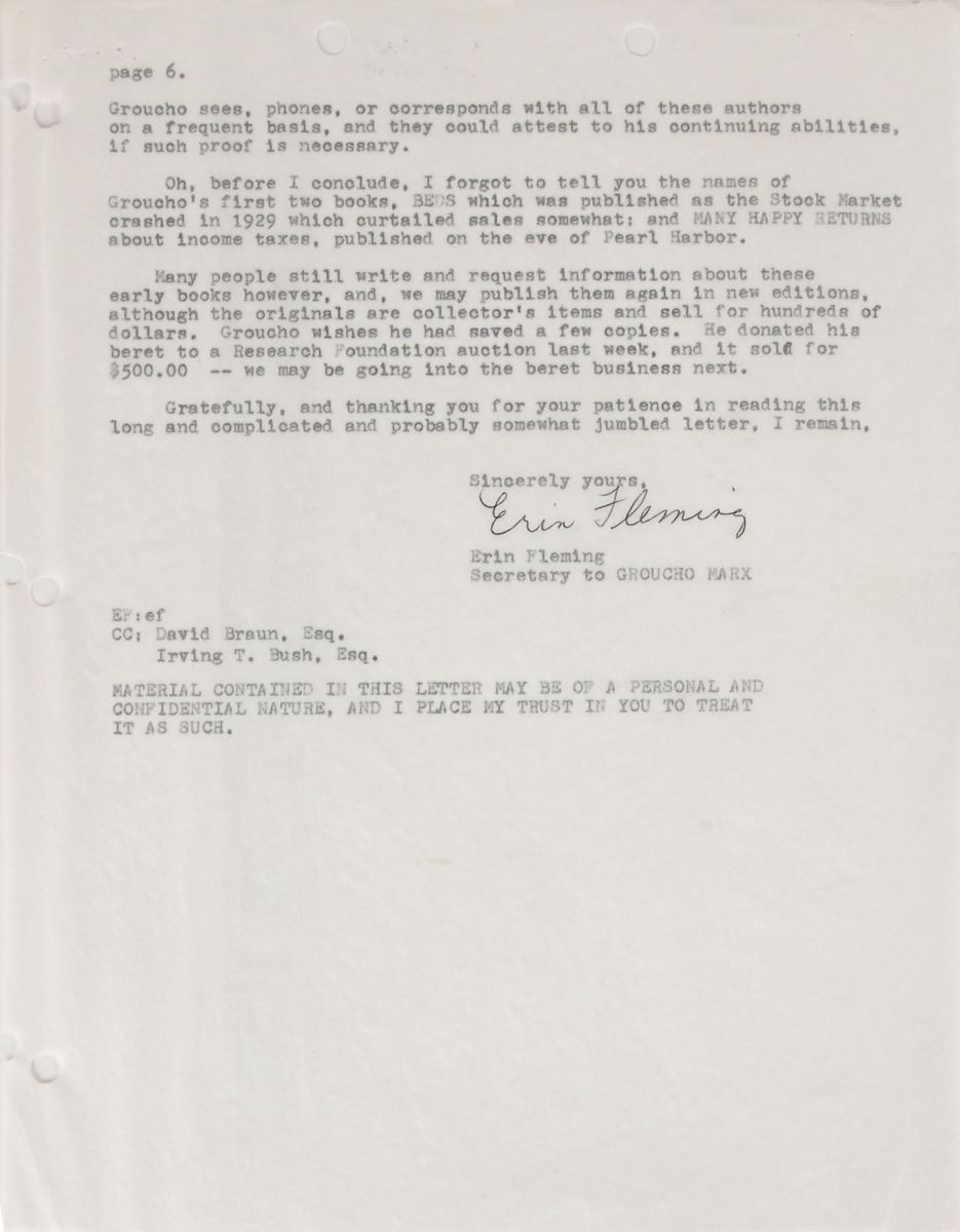 Unsigned TLS, six onionskin pages, 8.5 x 11, personal letterhead, October 20, 1974. Fascinating letter from Erin Fleming, the personal secretary to Marx, concerning the actor’s declining health, in part: “Please be advised that it will be totally impossible for Groucho to travel to New York ever again. He went to New York against the advice of his doctors and attended the opening of Animal Crackers…Groucho suffered several setbacks on that last trip, and he had to be hospitalized twice, for a total of three weeks, when he returned home…As you know, he is a man of great willpower, and I believe that his health could not withstand another such journey. He is fine now, i.e., as fine as can be expected, but I have hired one more nurse, so that he now has a nurse on duty 24 hours, three shifts per day. Before the Animal Crackers trip, he required two nurses: a night nurse (Traci) and a morning nurse (Barbara). Groucho’s condition is called ‘eschemia’…which engenders small strokes—these strokes do not necessarily impair his wit, but rather, his motor resources such as speech, walking, and general movement…Groucho is now in the process of re-writing his portion of the Scrapbook using the original transcripts, supplemented by many tape-recorded conversations that I have made. He is enjoying the writing immensely, although we are moving slowly as he tires easily…He may have slowed down a lot, but as he himself succinctly explains, ‘my body may be in neutral, but my brain is still in gear.’” In fine condition, with punch holes to tops and edges.