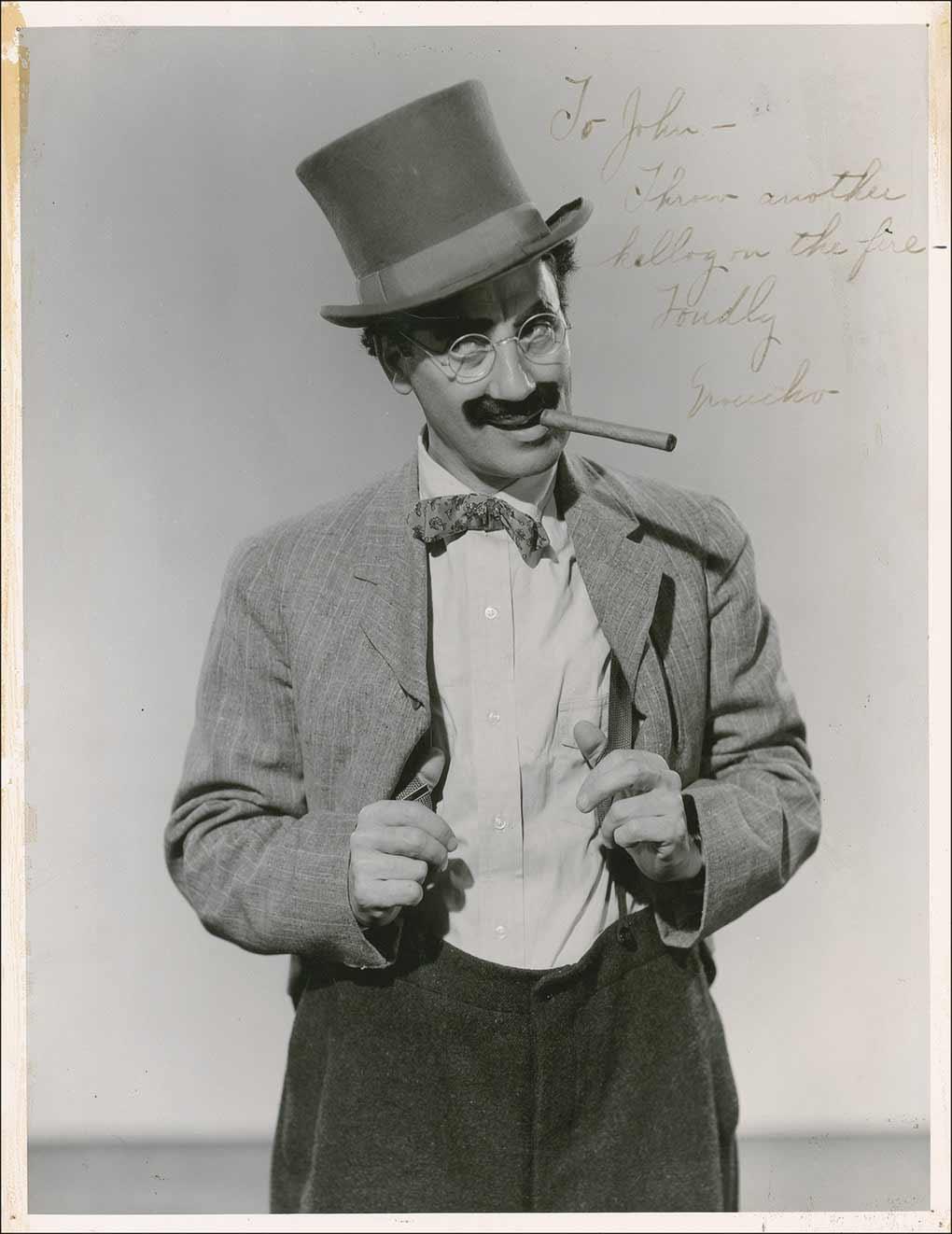 Vintage pearl-finish 10 x 13 MGM publicity photo of Groucho as S. Quentin Quale from Go West, signed and inscribed in fountain pen “To John—throw another kellog on the fire. Fondly, Groucho.” In very good condition, with signature and inscription light, but still completely legible, a single tack hole to each corner tip, adhesive and tape remnants to reverse, and toning and adhesive remnants to vertical edges.