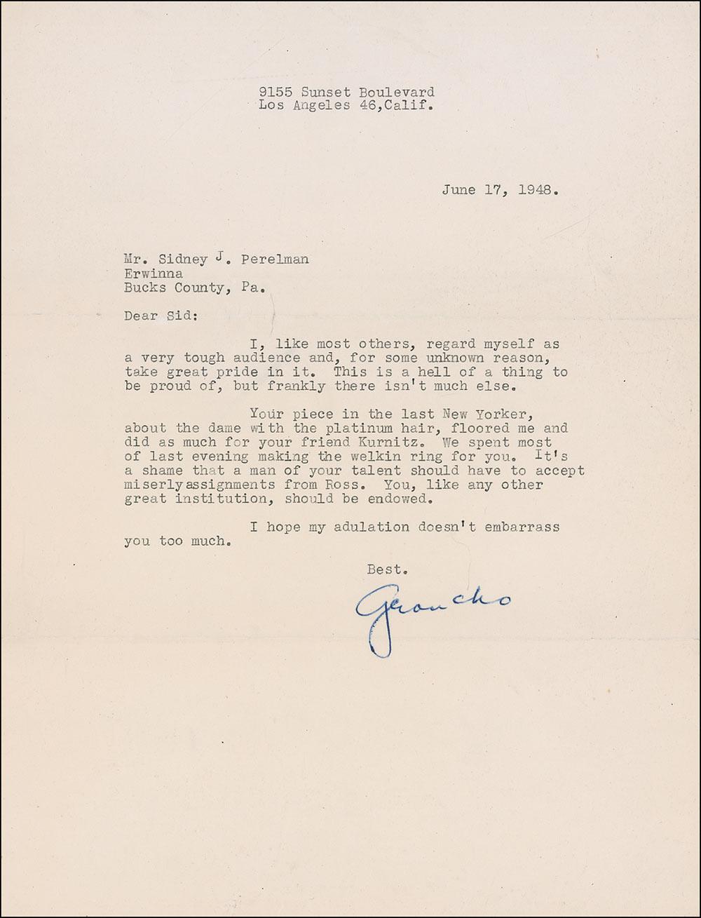 TLS signed “Groucho,” one page, 8.5 x 11, June 17, 1948. Letter to author and screenwriter Sidney J. Perelman. In full: “I, like most others, regard myself as a very tough audience and, for some unknown reason, take great pride in it. This is a hell of a thing to be proud of, but frankly there isn’t much else. Your piece in the last New Yorker, about the dame with the platinum hair, floored me and did as much for your friend Kurnitz. We spent most of last evening making the welkin ring for you. It’s a shame that a man of your talent should have to accept miserly assignments from Ross. You, like any other great institution, should be endowed.” In fine condition. Pre-certified PSA/DNA and RRAuction COA.