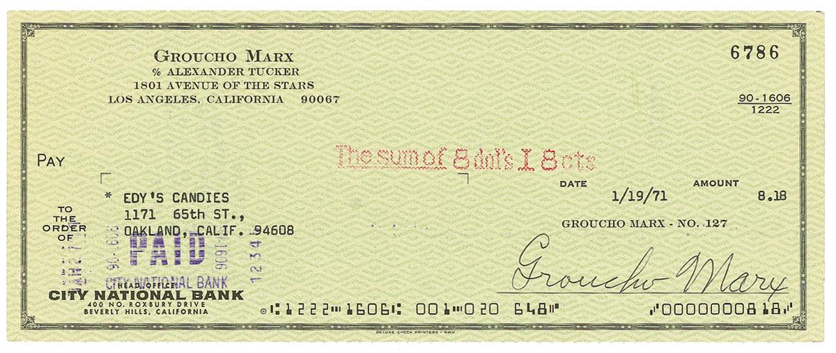 Personal check, 8.5 x 3.5, filled out in type and signed by Marx, payable to Edy’s Candies for $8.18, January 19, 1971. In fine condition, with cancellation stamp to lower left, not affecting the clean signature area.