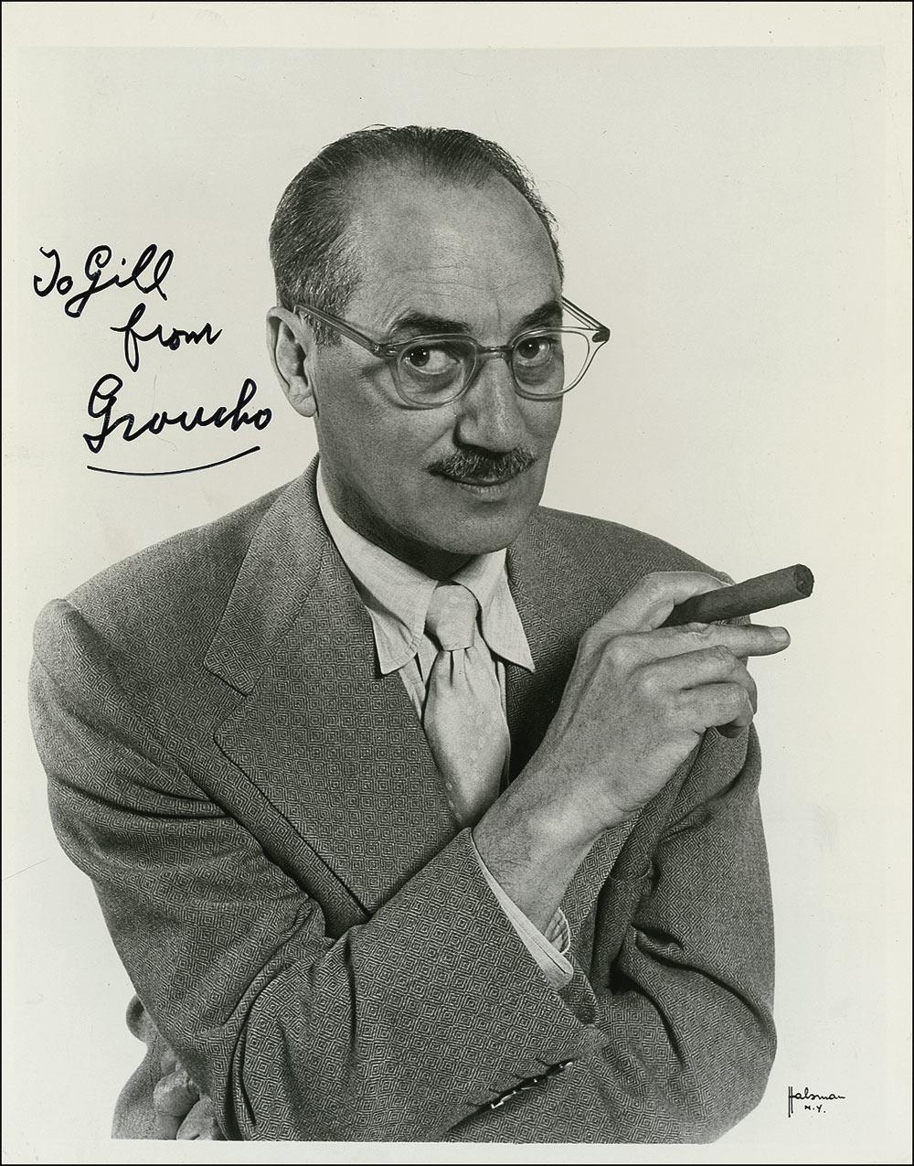 Glossy 8 x 10 photo of Groucho holding his cigar, signed and inscribed in black felt tip “To Gill from Groucho.” In very good condition, with scattered creases, a few lightly affecting signature, and multiple paperclip impressions along right edge.