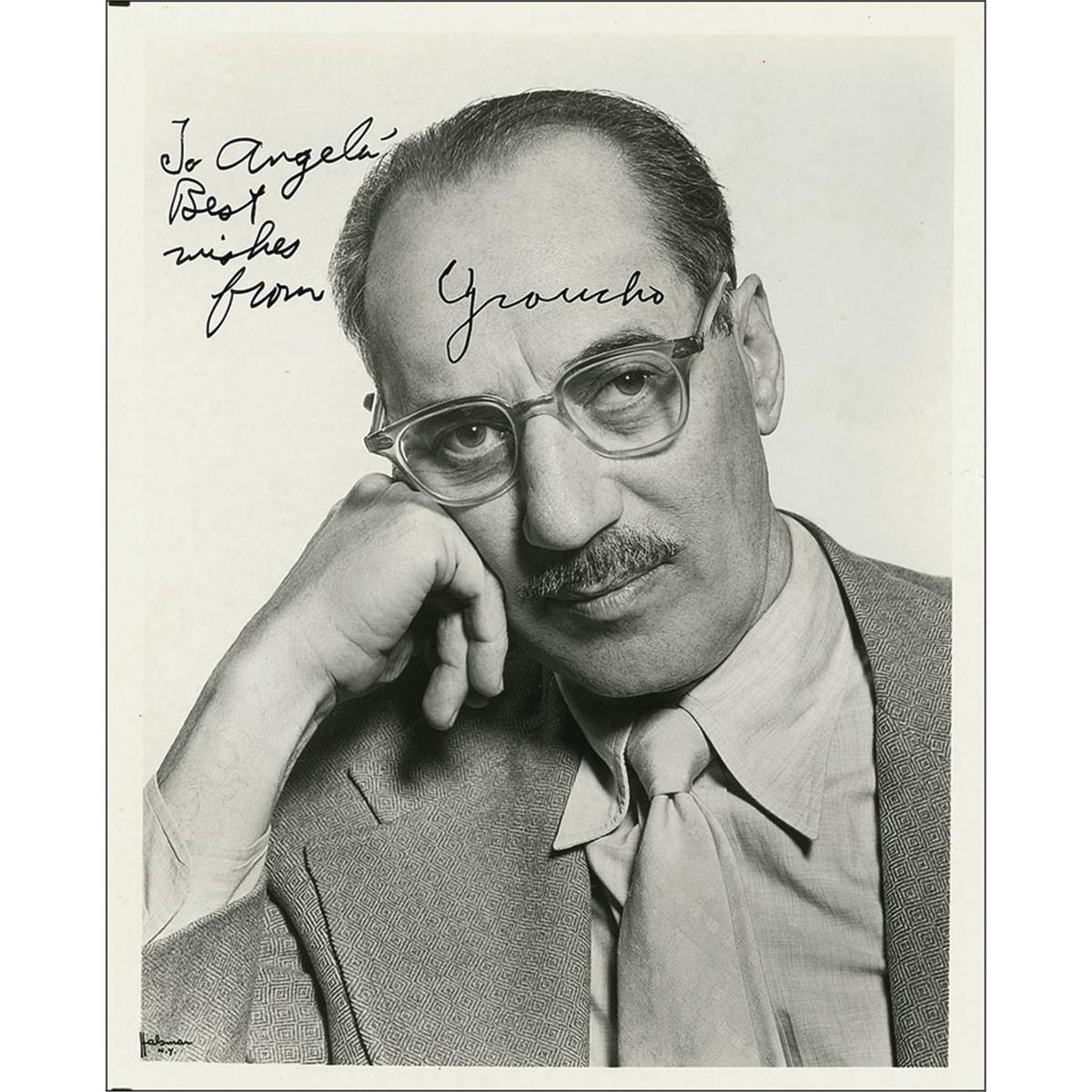 Glossy 8 x 10 photo of Groucho looking pensive, signed and inscribed in black felt tip “To Angela, Best wishes from Groucho.” Scattered light creases, mostly to edges, a few surface marks, and small tape remnant to right edge, otherwise fine condition.