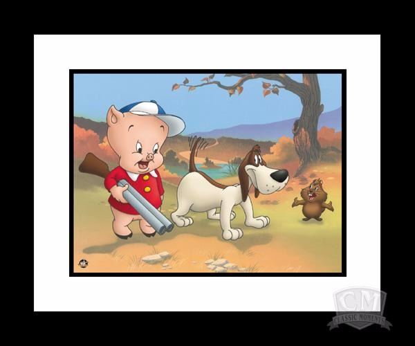 This framed limited edition 16x20 giclee is entitled “Groundhog's Day." This image is taken from "One Meat Brawl" released in 1947 and directed by Robert McKimson. It is Groundhog Day so, naturally, Porky Pig goes hunting groundhogs and takes his dopey d
