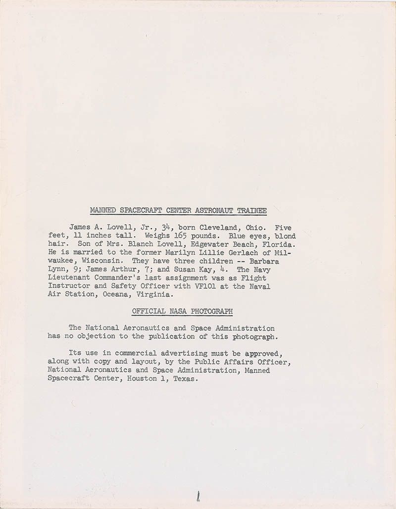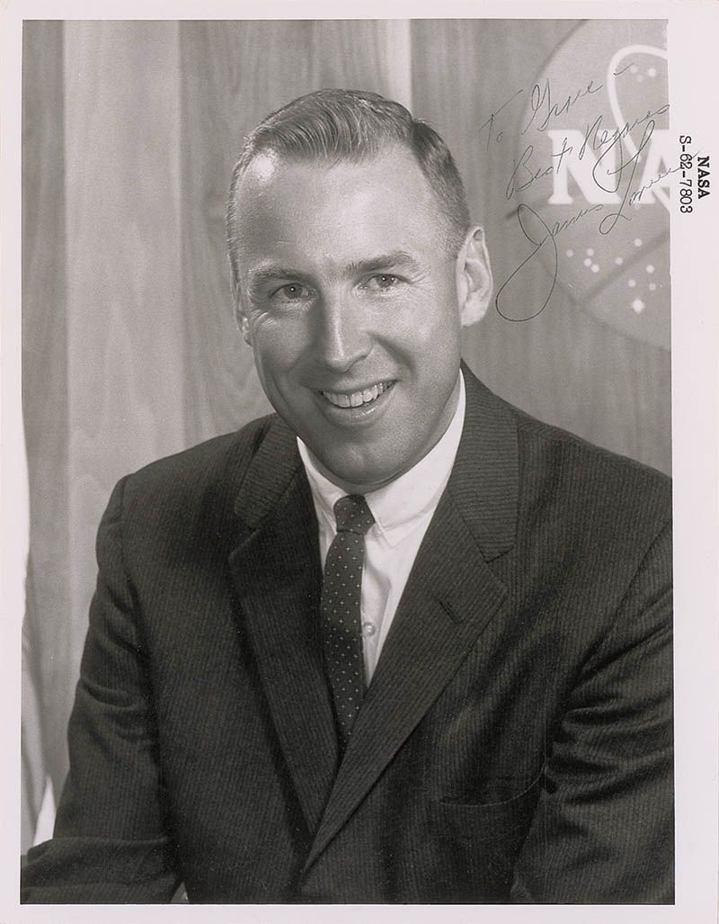 Uncommon and early vintage glossy 8 x 10 NASA photo of astronaut trainee Lovell, signed and inscribed in black ballpoint “To Grace—Best regards, James Lovell.” Printed information on the reverse is headed “Manned Spacecraft Center Astronaut Trainee,” and provides a brief biography of Lovell. In fine condition.