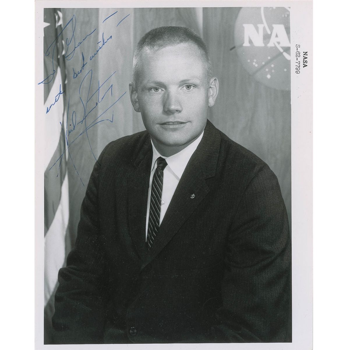 Rare vintage glossy 8 x 10 NASA photo of astronaut trainee Neil Armstrong, signed and inscribed in blue ink “To Grace—with best wishes—Neil Armstrong.” Printed information on the reverse is headed “Manned Spacecraft Center Astronaut Trainee,” and provides a brief biography of Armstrong. In fine condition, with scattered light surface marks and spots to finish, not affecting overall appearance. Armstrong actually missed the astronaut application deadline in 1962, but fortunately Dick Day, an associate of Armstrong’s from Edwards Air Force Base slipped the application into the pile. An exceptionally early portrait of arguably the most famous member of the ‘New Nine.’