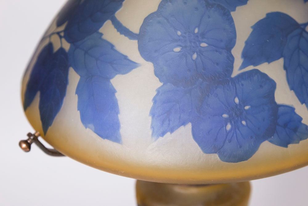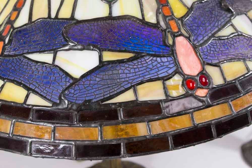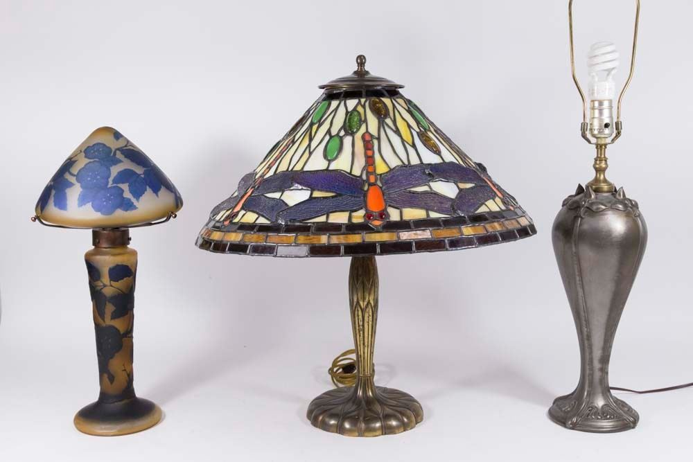 Including reproduction Galle lamp, pairpoint lamp, and Tiffany style lamp. Largest approx. 29" H to finial. From an Edgewater, NJ estate. Pairpoint lamp with broken shade.
