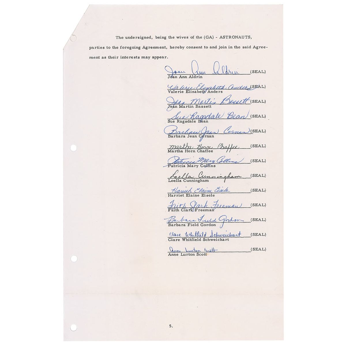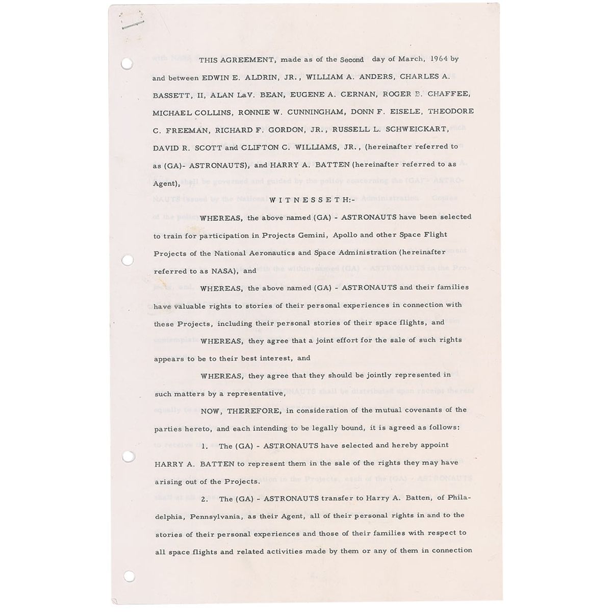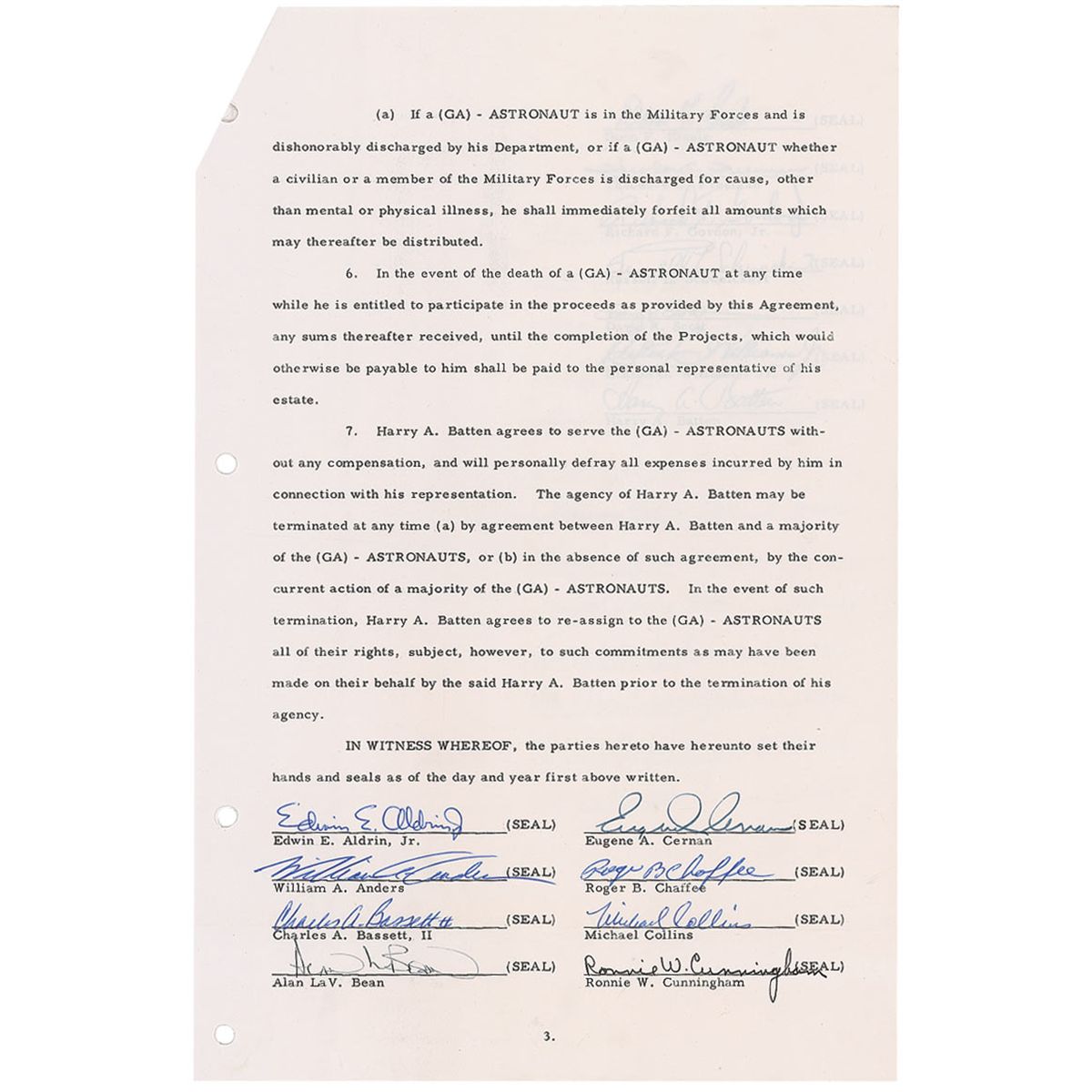 DS, signed by Edwin E. Aldrin, Jr., William A. Anders, Charles A. Bassett, II, Alan L. Bean, Eugene A. Cernan, Roger B. Chaffee, Michael Collins, Ronnie W. Cunningham, Donn F. Eisele, Theodore C. Freeman, Richard F. Gordon, Jr., Russell L. Schweickart, David R. Scott, and Clinton C. Williams, Jr., five pages, 8.5 x 13, March 2, 1964. Agreement of fifteen Group 3 astronauts in which they elect to have Harry A. Batten represent them as their agent. In part: “Whereas the above named…Astronauts have been selected to train for participation in Projects Gemini, Apollo and other Space Flight Projects of the National Aeronautics and Space Administration (hereinafter referred to as NASA), and…[the] Astronauts and their families have valuable rights to stories of their personal experiences in connection with these Projects, including their personal stories of their space flights…[the] Astronauts have selected and hereby appoint Harry A. Batten to represent them in the sale of the rights they may have arising out of the projects.” Also signed by Batten and the wives of the astronauts. Horizontal filing fold at the bottom of each page, light wrinkling, four punch holes along the left side, and a staple and staple holes at the top left corner, otherwise fine condition. An amazing document signed by four astronauts who would be killed in training and four future moonwalkers, all with desirable ‘full name’ signatures.