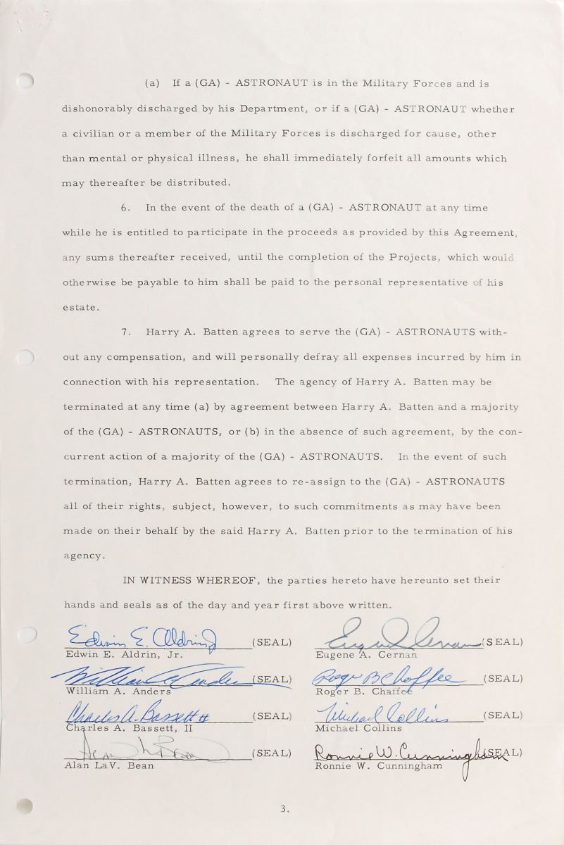 Amazing DS, five pages, 8.5 x 13, March 2, 1964. Agreement contract between NASA astronaut group 3 and Harry A. Batten, in which the group "have selected and hereby appoint Harry A. Batten to represent them in the sale of the rights they may have arising" from Gemini, Apollo, and other NASA projects. Signed on the third and fourth pages in blue or black ink by fourteen prospective astronauts, including: "Edwin E. Aldrin, Jr.," "Eugene A. Cernan," "William A. Anders," "Roger B. Chaffee," "Charles A. Bassett II," "Michael Collins," "Alan L. Bean," "Ronnie W. Cunningham," "Donn F. Eisele," "Theodore C. Freeman," "Richard F. Gordon, Jr.," "Russell L. Schweickart," "David R. Scott," and "Clifton C. Williams, Jr." Countersigned in blue ink by Batten, with the last page signed in blue or black ink by thirteen astronaut wives. In fine condition. Akin to Leo De Orsey and the Mercury Project, Philadelphian lawyer and advertising man Harry Batten represented the majority of the second and third groups of astronauts selected for the Gemini and Apollo programs. And again like De Orsey, Batten helped the new astronauts land a major publishing deal with Life Magazine soon thereafter, introducing America to a whole new cast of space explorers. Highlighted by a quartet of moonwalkers-Aldrin, Bean, Cernan, and Scott-as well as the presence of tragic heroes Chaffee, Williams, Batten, and Freeman, this is an incredible multi-signed contract related to the group's oncoming rush of media exposure. Pre-certified Zarelli Space Authentication.