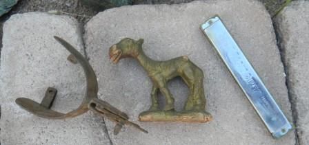 Collection, comical mule six inches, antique spur six inches, harmonica 7 inches. Good condition. Shipping $15.00