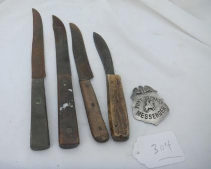 Four Trade Knives and a Pony Express Badge. Knives are from 8 to 12 inches. Condition - knives are old and rusty and carbon steel, Circa 1900. Shipping $18.00
