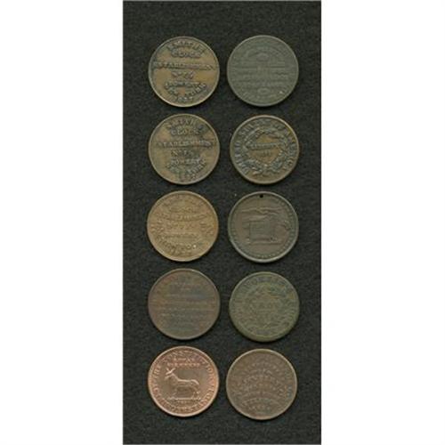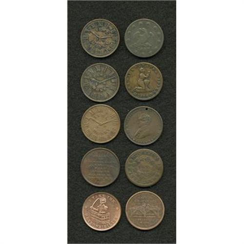 <B>10-Piece Hard Times Token Lot.</B></I> Group lot of 10 Hard Times tokens, ranging from Fine 12 to MS60 (uncertified). Most of the pieces are either VF or XF. The single Uncirculated piece is the Low-51, HT-70 example. Includes: <B>Low-51, HT-70; Low-56, HT-75; Low-54, HT-81; Low-164, HT-151; Low-131, HT-192; Low-126, HT-290; Low-133, HT-311; Low-134, HT-313; Low-138, HT-317; </B></I>and <B>Low-92, HT-353.<BR> </B></I><BR><BR><b>Shipping:</b> Coins & Currency (<a target="_blank" href="http://www.heritageauctions.com/common/shipping.php">view shipping information</a>)