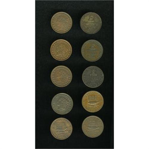 <B>10-Piece Hard Times Token Lot.</B></I> Ten Hard Times tokens, VF to AU, mostly XF. Includes: <B>(two)</B></I> <B>Low-8, HT-9</B></I>; <B>Low-10, HT-11</B></I>; <B>(two) Low-18, HT-32</B></I>; <B>Low-20</B></I>, <B>HT-34</B></I>; <B>Low-28, HT-42</B></I>; <B>Low-31, HT-46</B></I>; <B>Low-34, HT-49</B></I>; and <B>Low-39, HT-52</B></I>. <BR><BR><b>Shipping:</b> Coins & Currency (<a target="_blank" href="http://www.heritageauctions.com/common/shipping.php">view shipping information</a>)