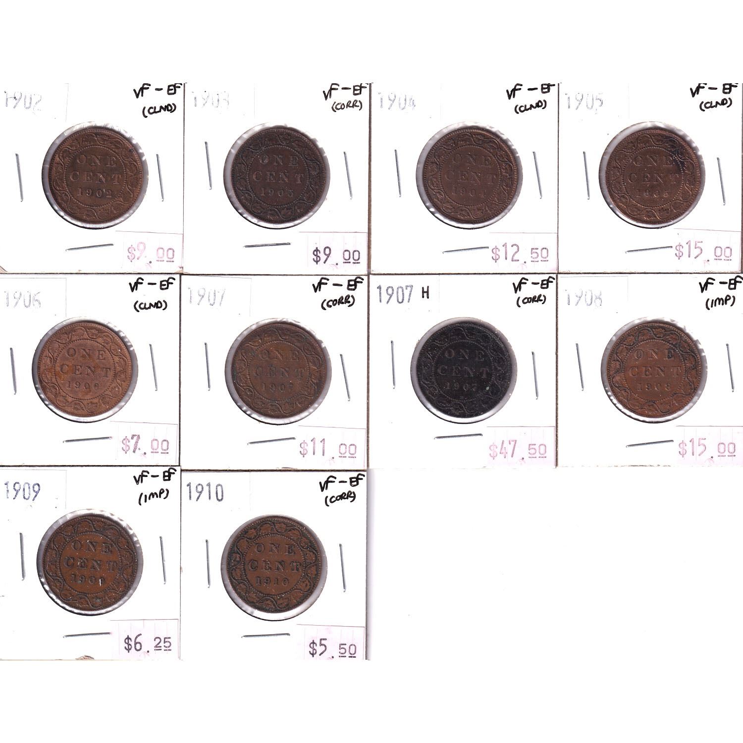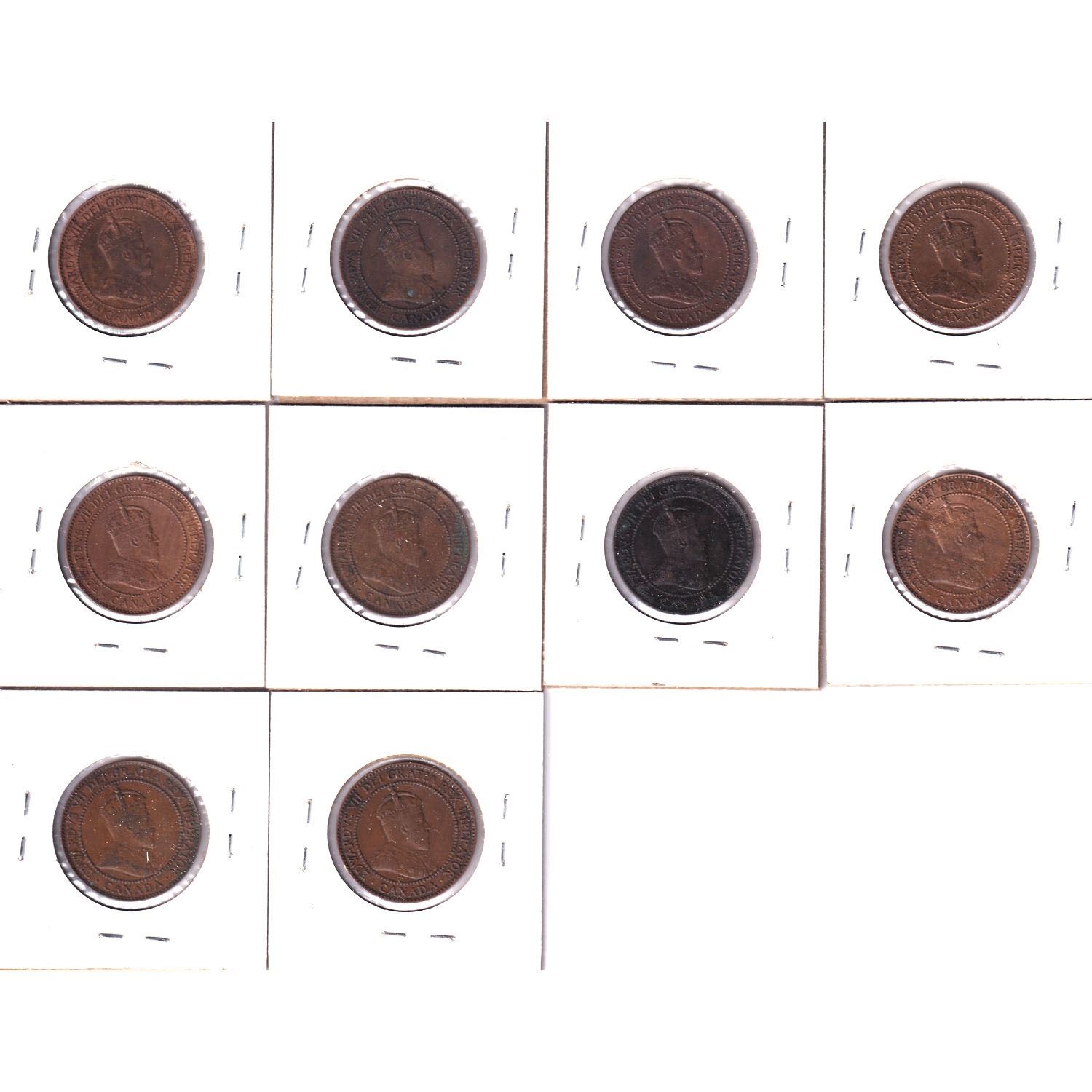Group Lot 10x Canada Large 1-cent. Lot includes: 1902, 1903, 1904, 1905, 1906, 1907, 1907H, 1908, 19