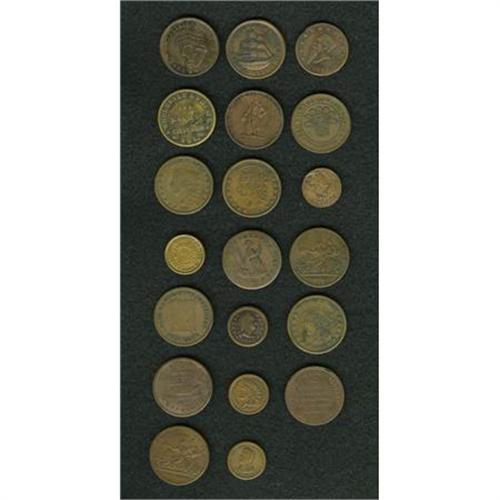 <B>Miscellany of 20 Tokens. </B></I> Group lot of 20 miscellaneous tokens, most either Hard Times or Civil War tokens, struck in copper. At least one brass piece was noted. The average grade is VF, with several noted in XF and one worn example at AG3. <BR><BR><b>Shipping:</b> Coins & Currency (<a target="_blank" href="http://www.heritageauctions.com/common/shipping.php">view shipping information</a>)