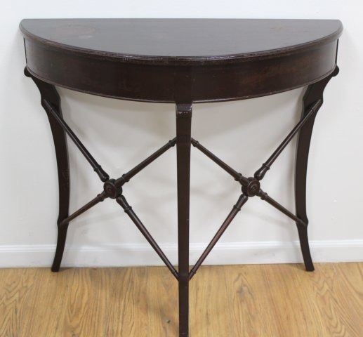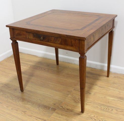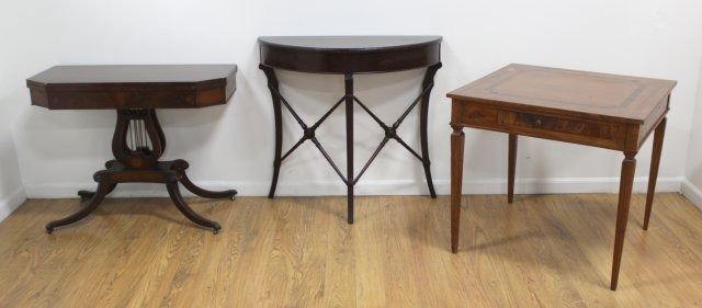 Including inlaid mahogany game table, approx. 28"  H; inlaid table with 1 drawer, approx. 28" H x 30  3/4" W; and demilune mahogany console table,  approx. 33" H x 36" W x 15" D. All with some  losses.