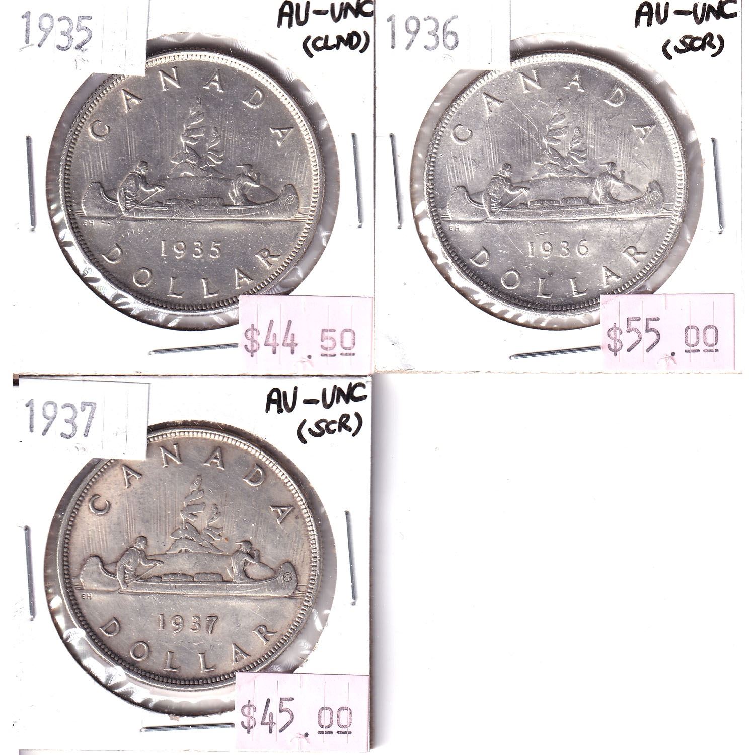 Group Lot 3x Silver $1: 1935, 1936, & 1937. First 3 years of issue. All coins AU-UNC. Coins may be lightly cleaned or impaired. 3pcs
