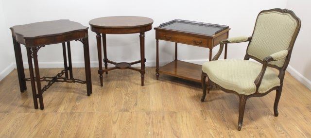 Including French style armchair; Chippendale style mahogany table, approx. 28" H x 26" W; oval table, approx. 27 1/2" H x 28" W; granite top Beacon Hill table, approx. 24 1/2" H x 28" W x 18 1/2" D. All with some losses.