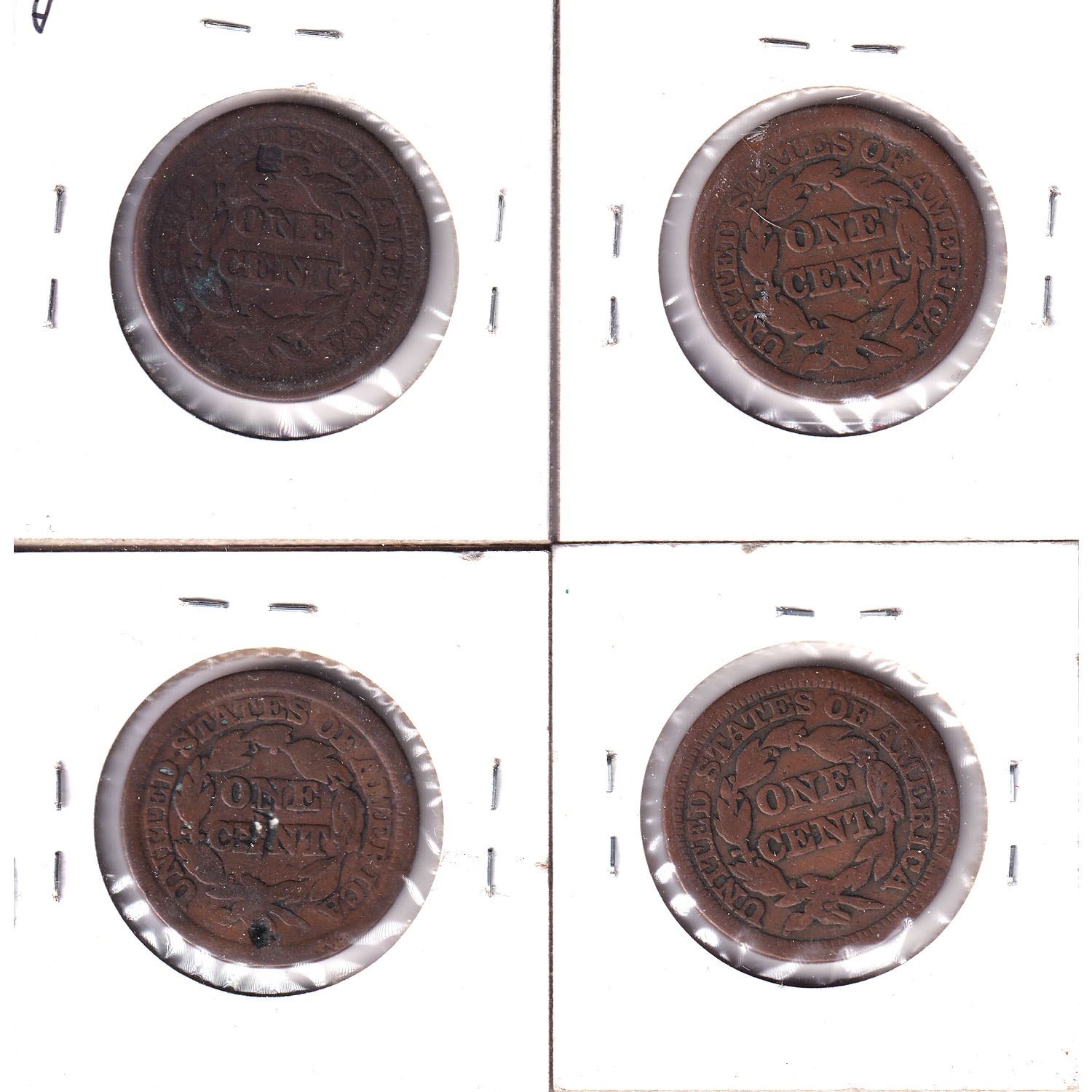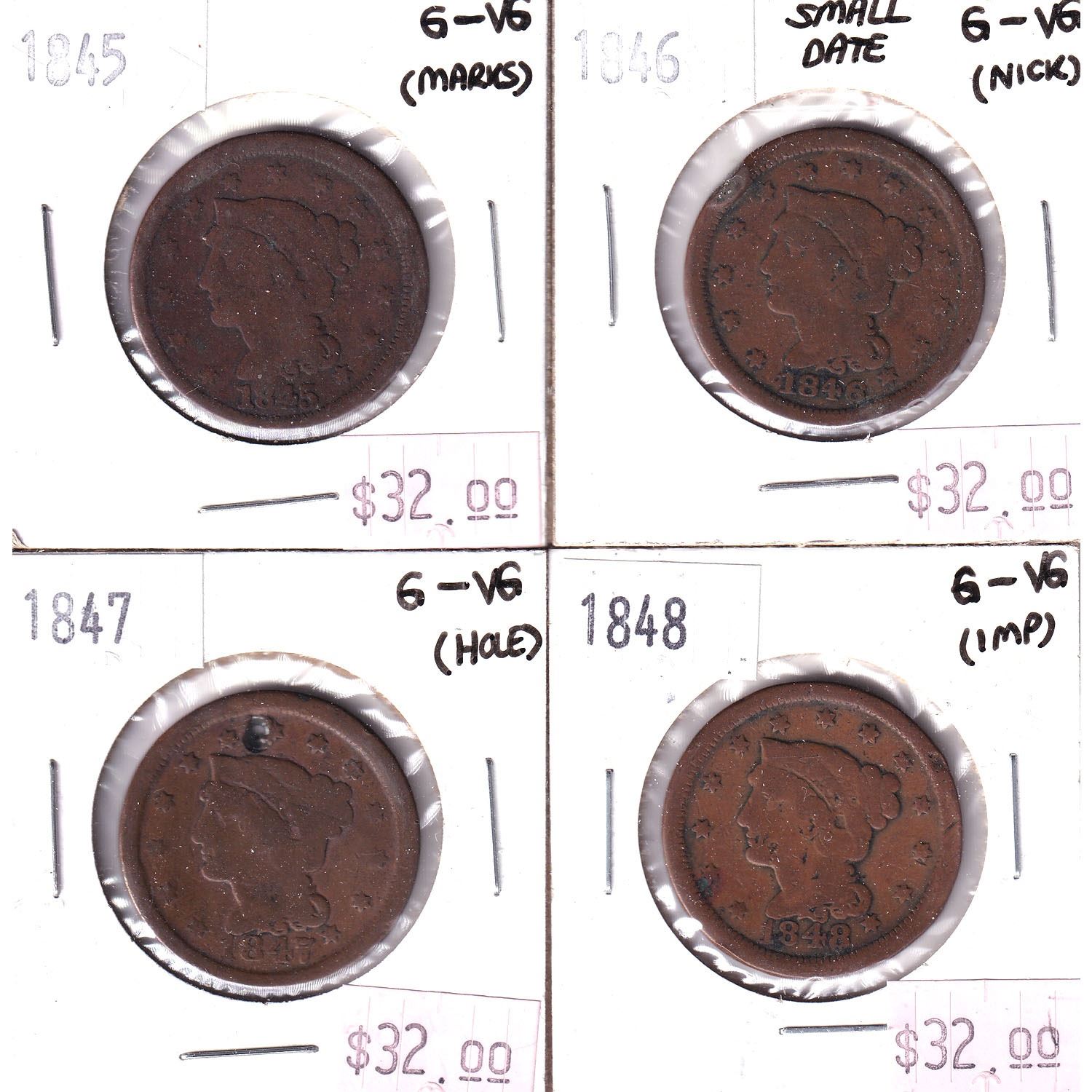 Group Lot 4x USA Large Cents. Lot Includes: 1845, 1846 Sm Date, 1847 Holed, & 1848. Coins are low grade with Impairments. Please view Images. 4pcs