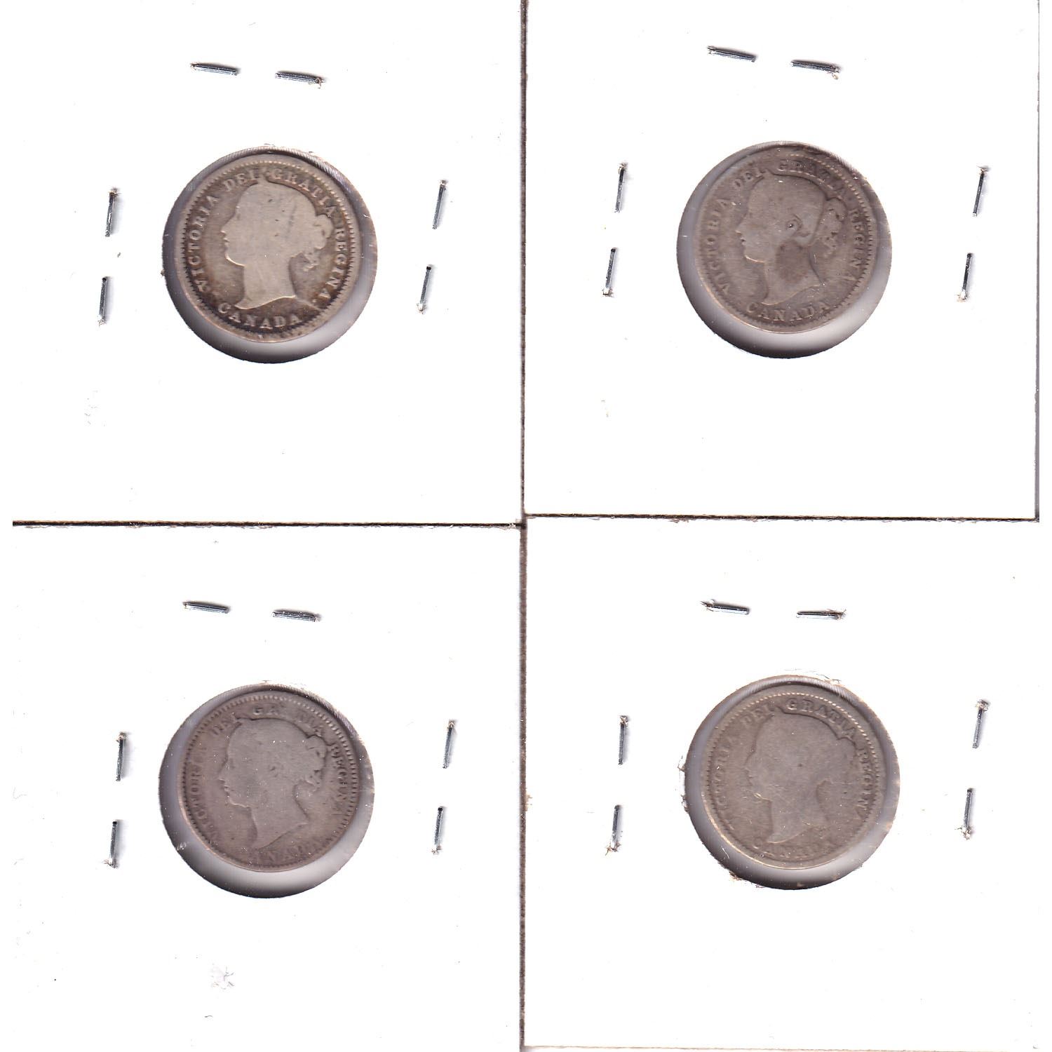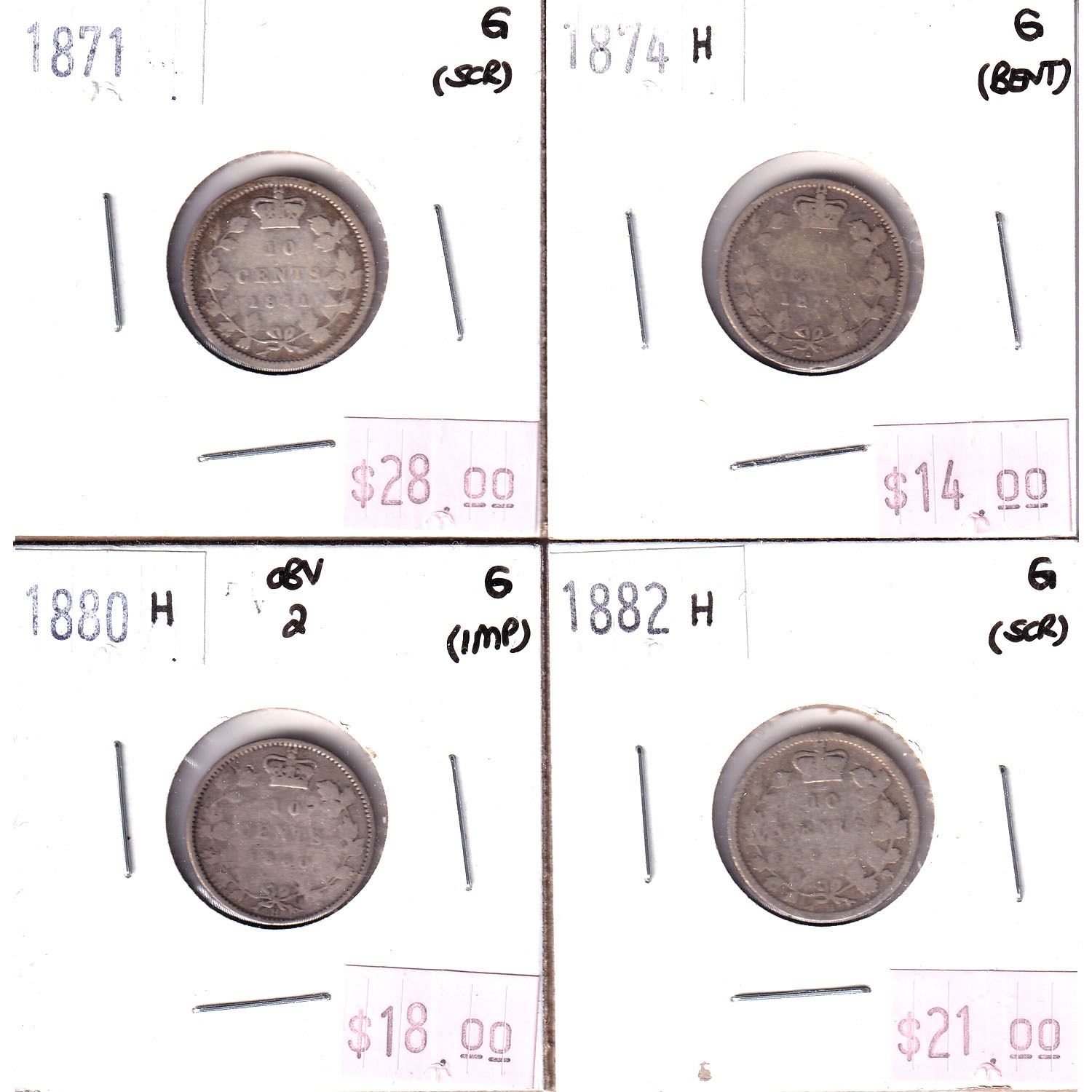 Group Lot 4x Victorian Silver 10-cent. Lot includes: 1871, 1874H, 1880H Obv.2, 1882H. All coins are G-4. Coins may be lightly cleaned or impaired. 4pcs