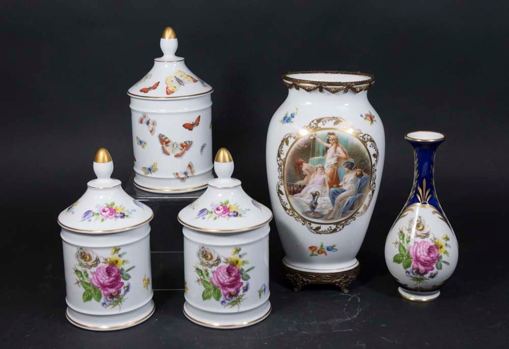 Including 4 pieces Limoges, 1 unsigned. 3 Limoges covered canisters, 1 with butterflies, 1 floral, approx. 8 1/2" H. Floral vase, approx. 8 1/2" H; and vase with classical females, approx. 11 1/4" H. (6016)