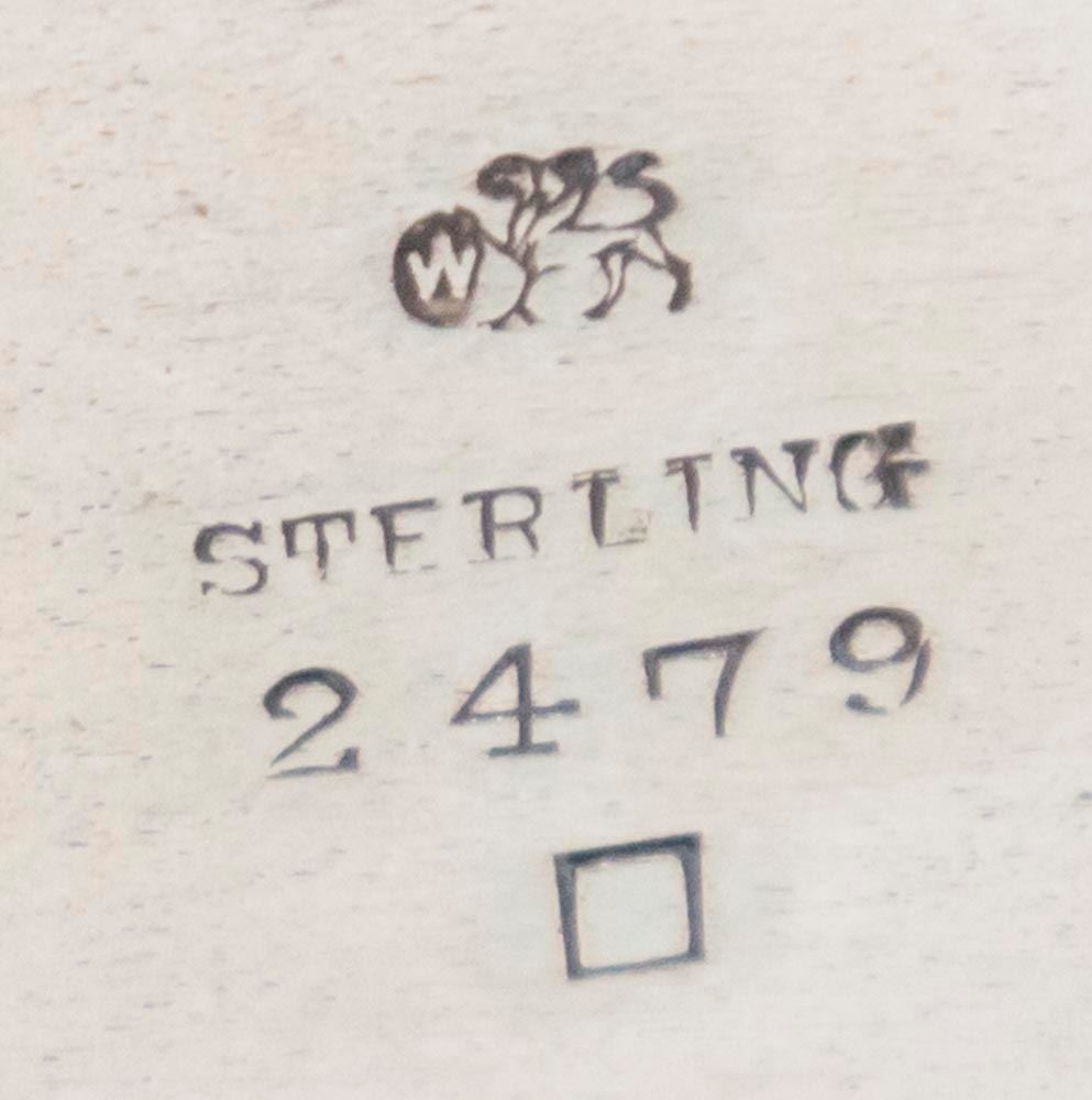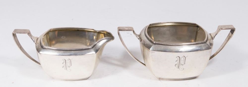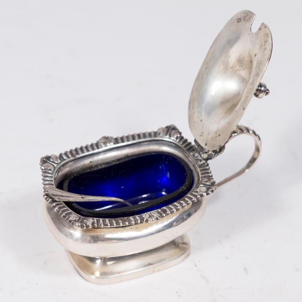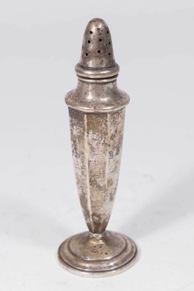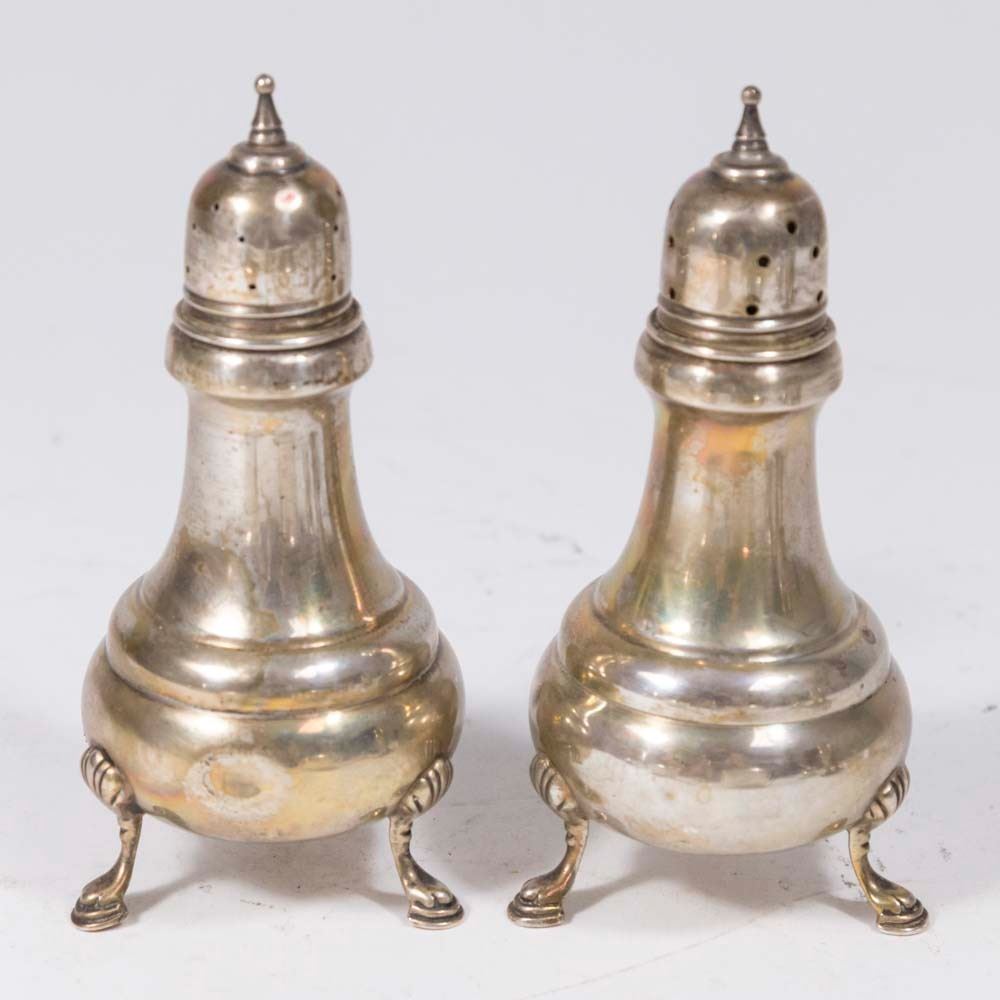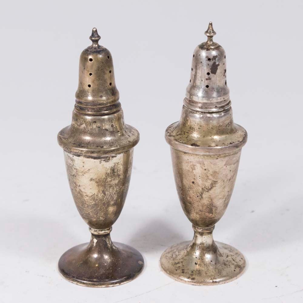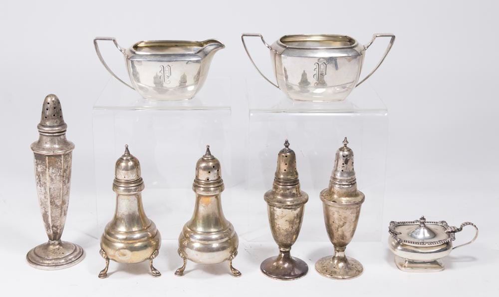 Including 2 pairs of salt & pepper shakers, single salt (weighted), creamer & sugar, and mustard cup with cobalt glass insert. Weighable silver approx. 13.7 ozt. 737 grams. Property from the collection of Hank Willoughby, Allenwood, NJ. Some dents.