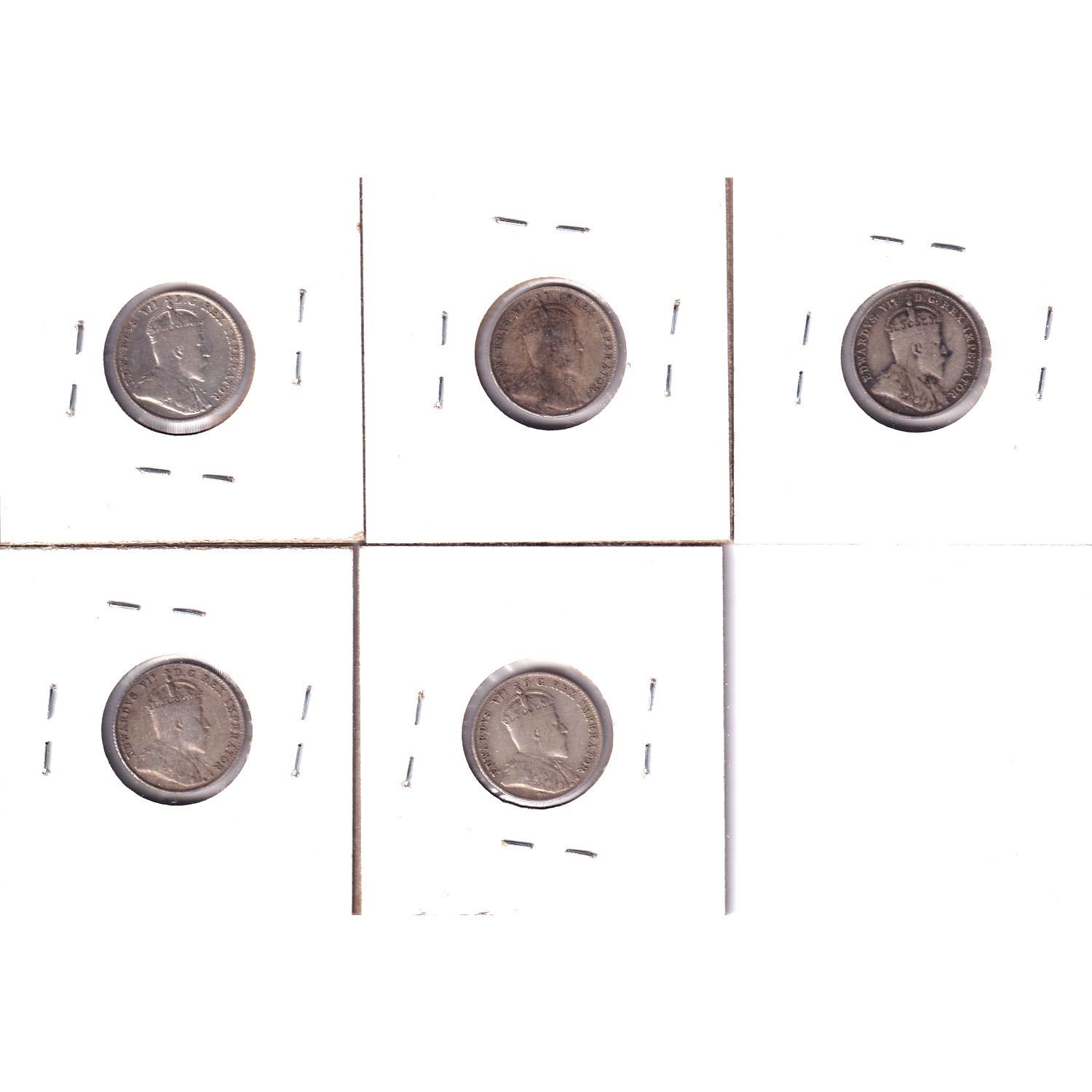 Group Lot 5x Edward VII Silver 10-cent. Lot includes: 1905, 1906, 1907, 1908 & 1910. All coins F-12 to F-15. Coins may be lightly cleaned or impaired. 5pcs