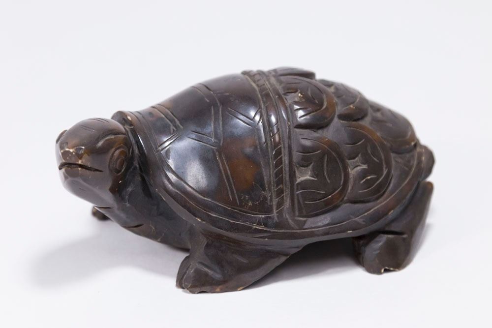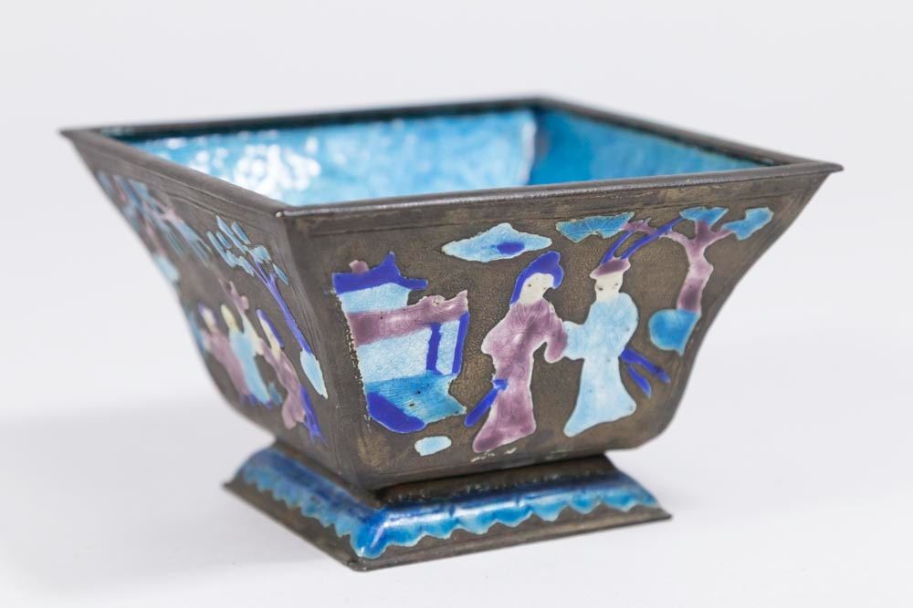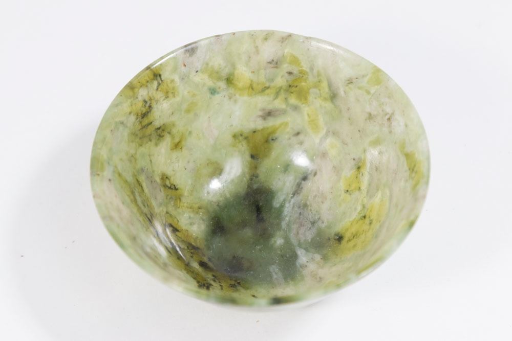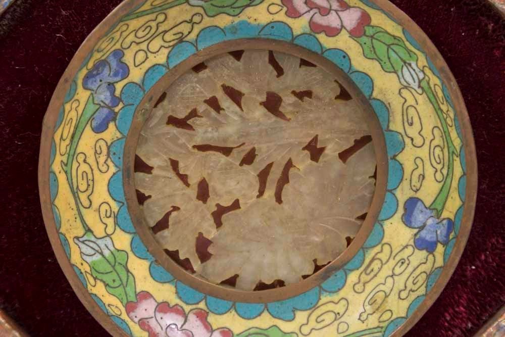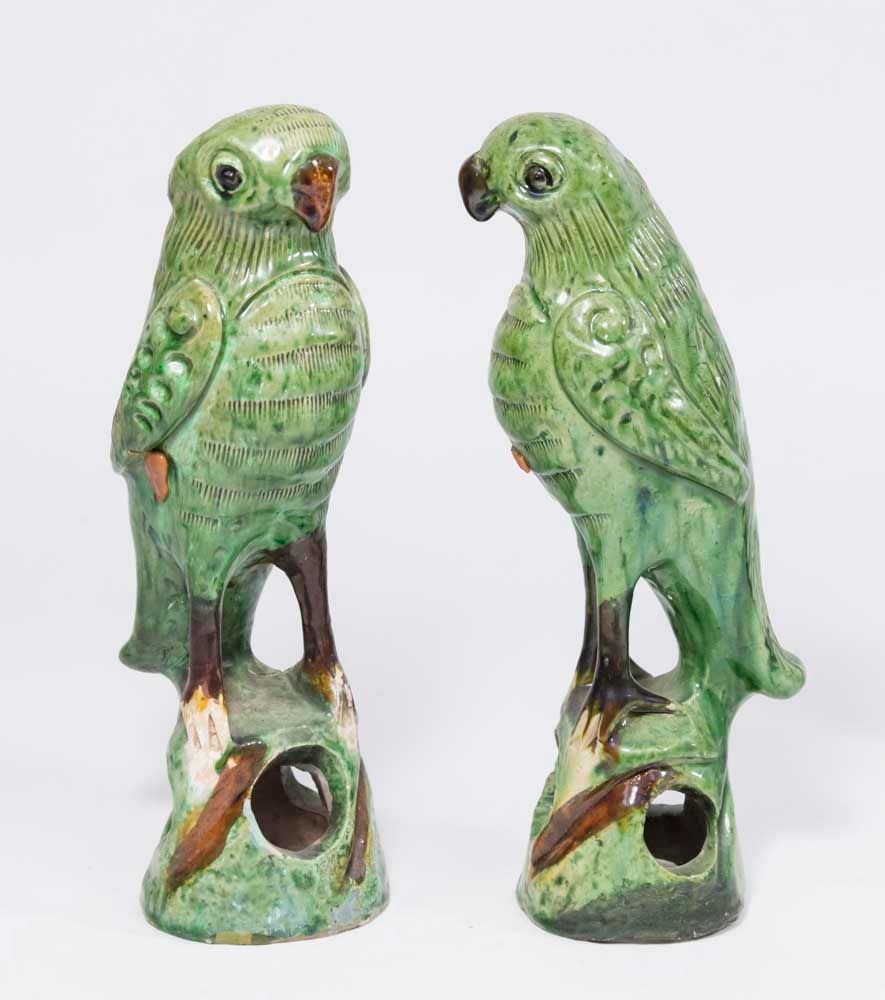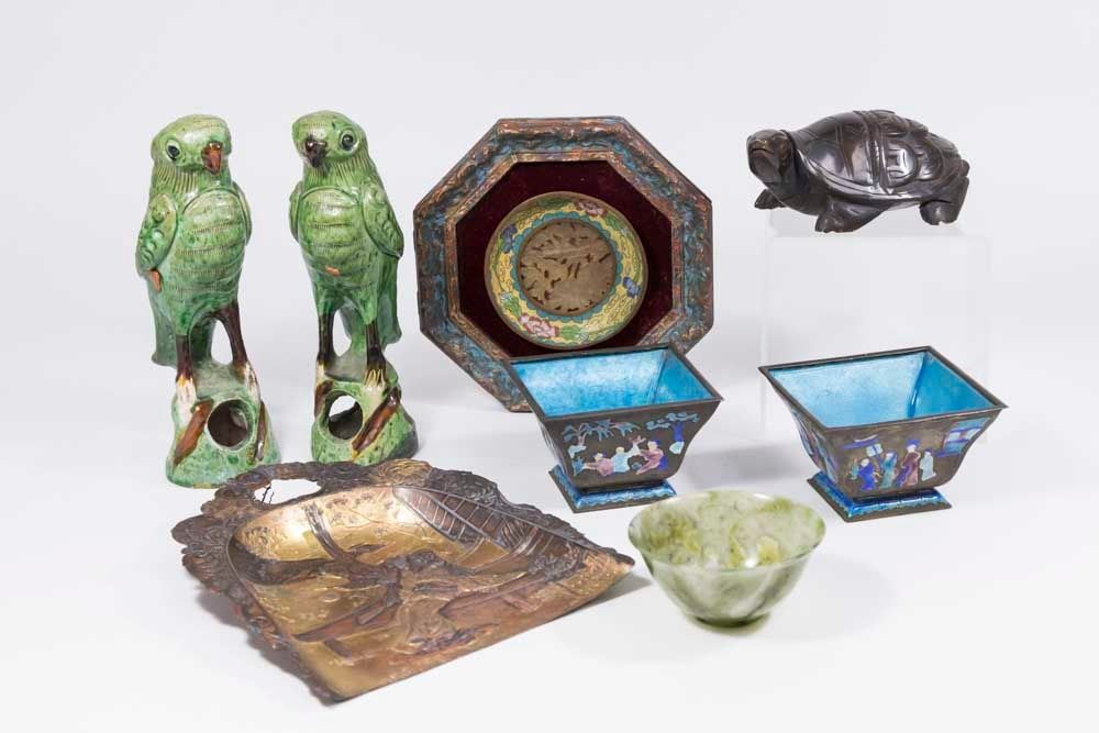Including jade bowl, pair pottery parrots, pair Chinese enamel bowls, framed cloisonné & jade dish, stone turtle, and mixed metal dust pan. Various sizes. Parrots approx. 8 1/2" H.