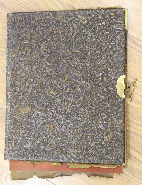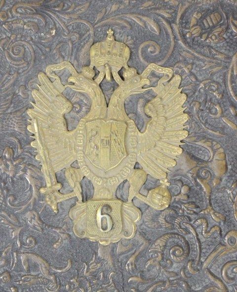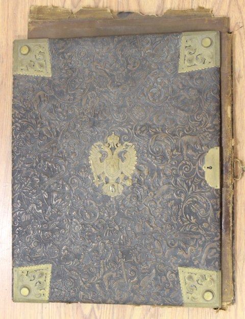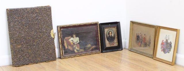 Including embossed leather & gilt metal file folder wih coat of arms, approx. 18" x 14"; 2 oils, one on canvas, one on board, one of Marie Von Eichhoff, other not signed or titled; painted coat of arms; and print with generals. Largest painting approx. 11" x 15". From a royal Austro-Hungarian family dating back centuries. (6173)