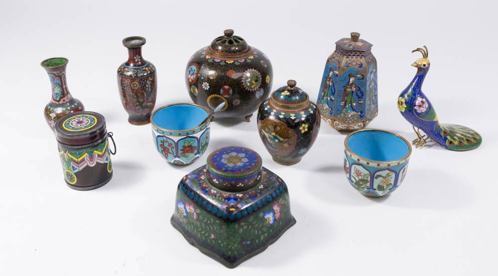 Including cabinet-size cases, censer, covered jars, inkwell, peacock, and more. 11 pieces total. From a Manhattan estate.